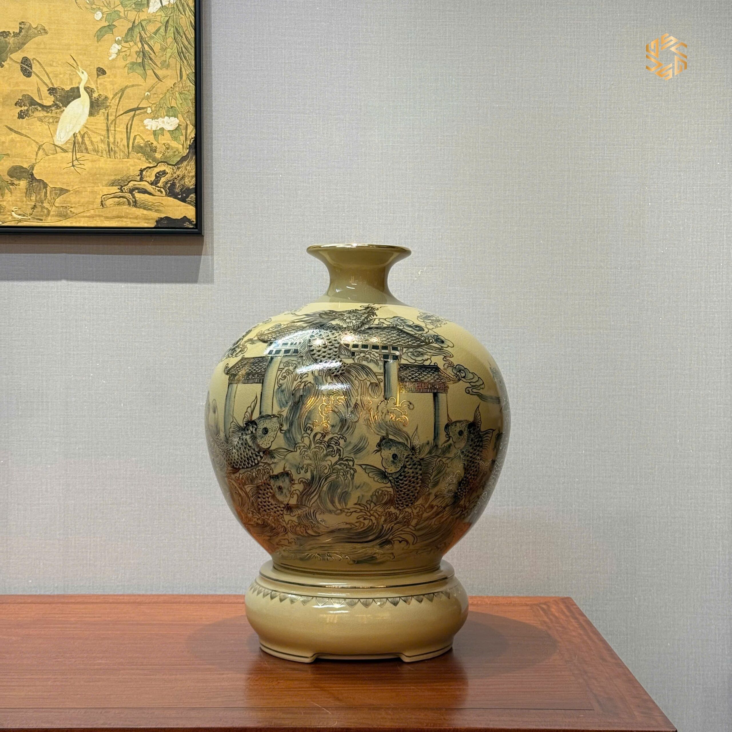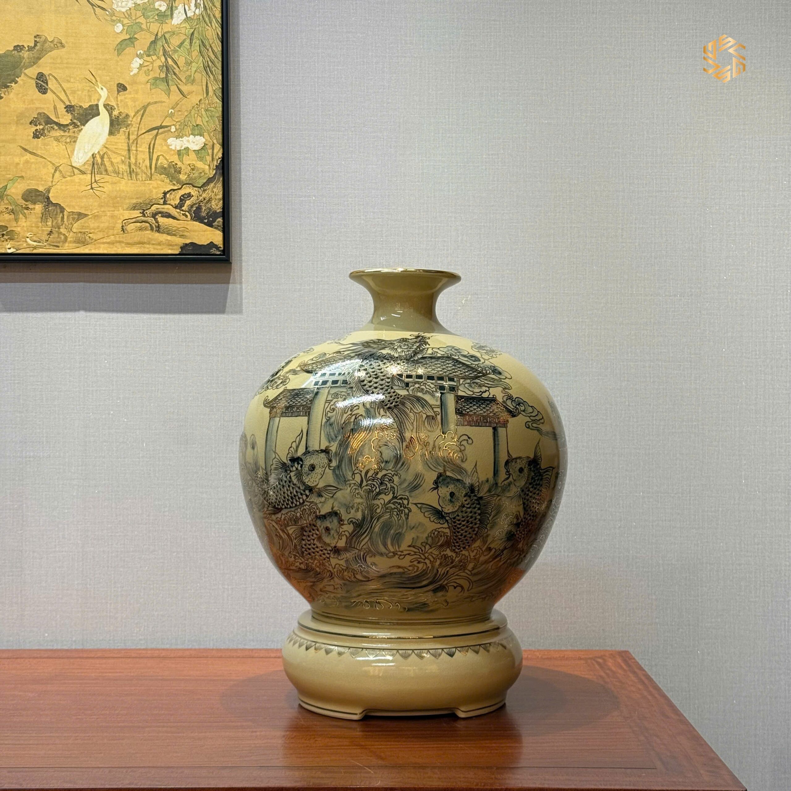 Bình Hút Lộc Gốm Chu Đậu H45 Hoạ Tiết Cá Chép Vượt Vũ Môn Vẽ Vàng 24K