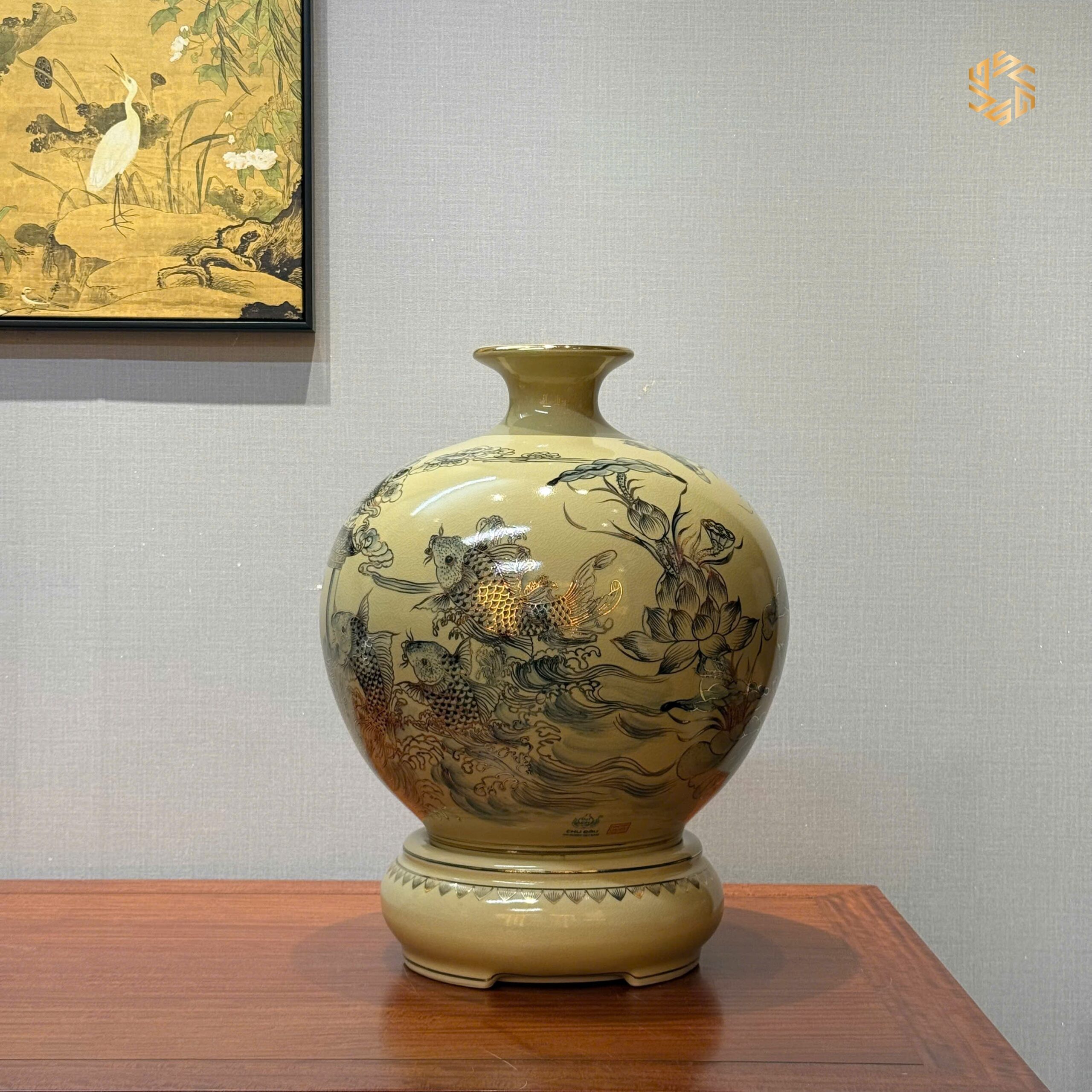 - Bình Hút Lộc Gốm Chu Đậu hoạ tiết Cá Chép Vượt Vũ Môn Vẽ Vàng 24K từ làng nghề truyền thống Chu Đậu nổi tiếng của Việt Nam, là món quà tặng vô cùng ý nghĩa phù hợp trong nhiều trường hợp cụ thể như: Biếu Tặng Sếp – Lãnh Đạo, Tân Gia, Tặng Doanh Nghiệp, Hội Nghị.