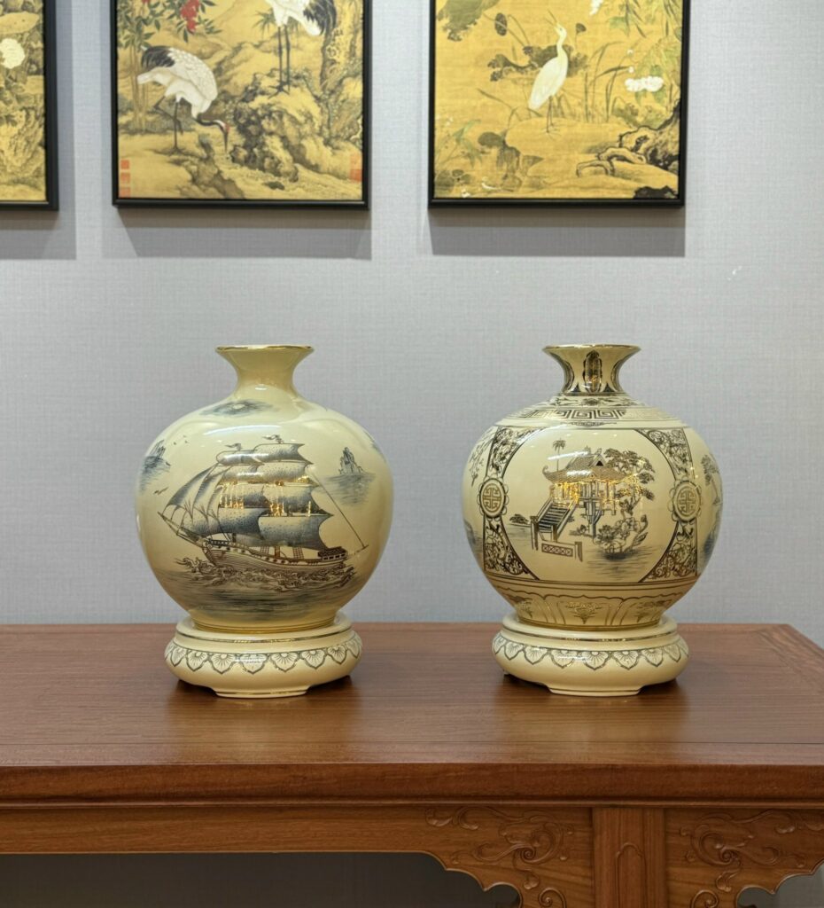 Cặp Bình Hút Lộc Thuận Buồm Xuôi Gió – Tứ Cảnh Hà Nội H30 Vẽ Vàng 24K Tinh Xảo