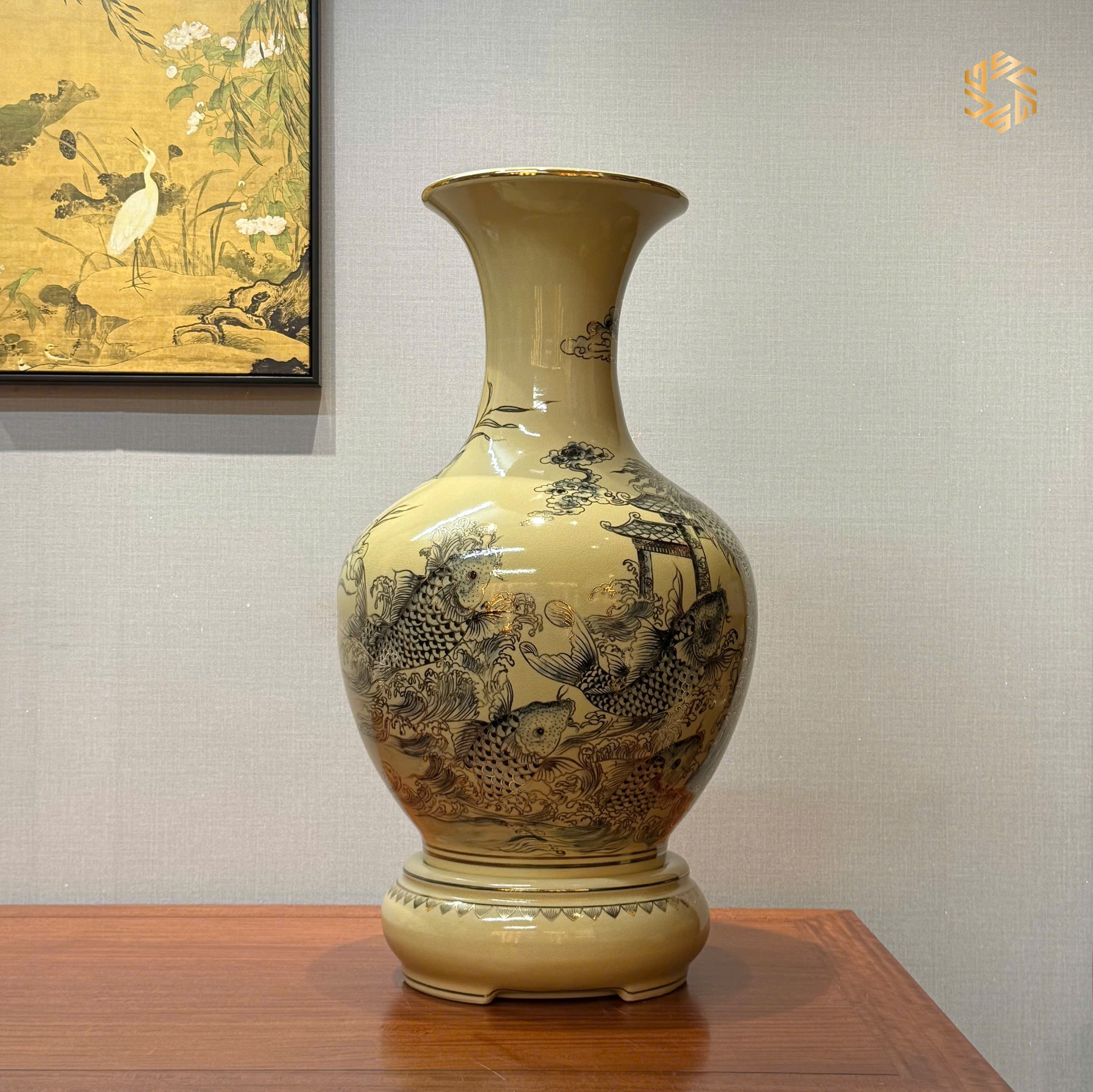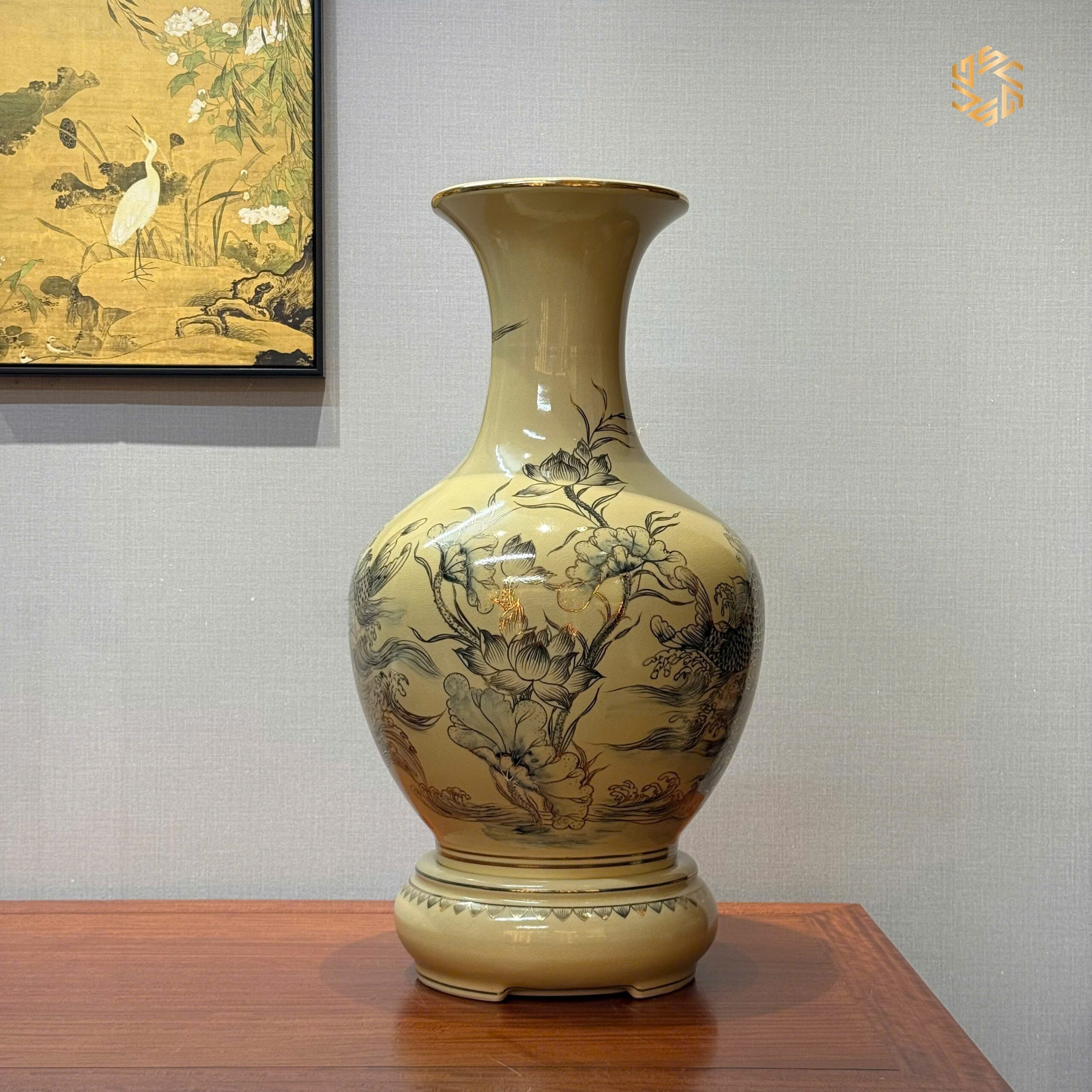 Bình Phú Quý Gốm Chu Đậu H65 Hoạ Tiết Cá Chép Vượt Vũ Môn Vẽ Vàng 24K