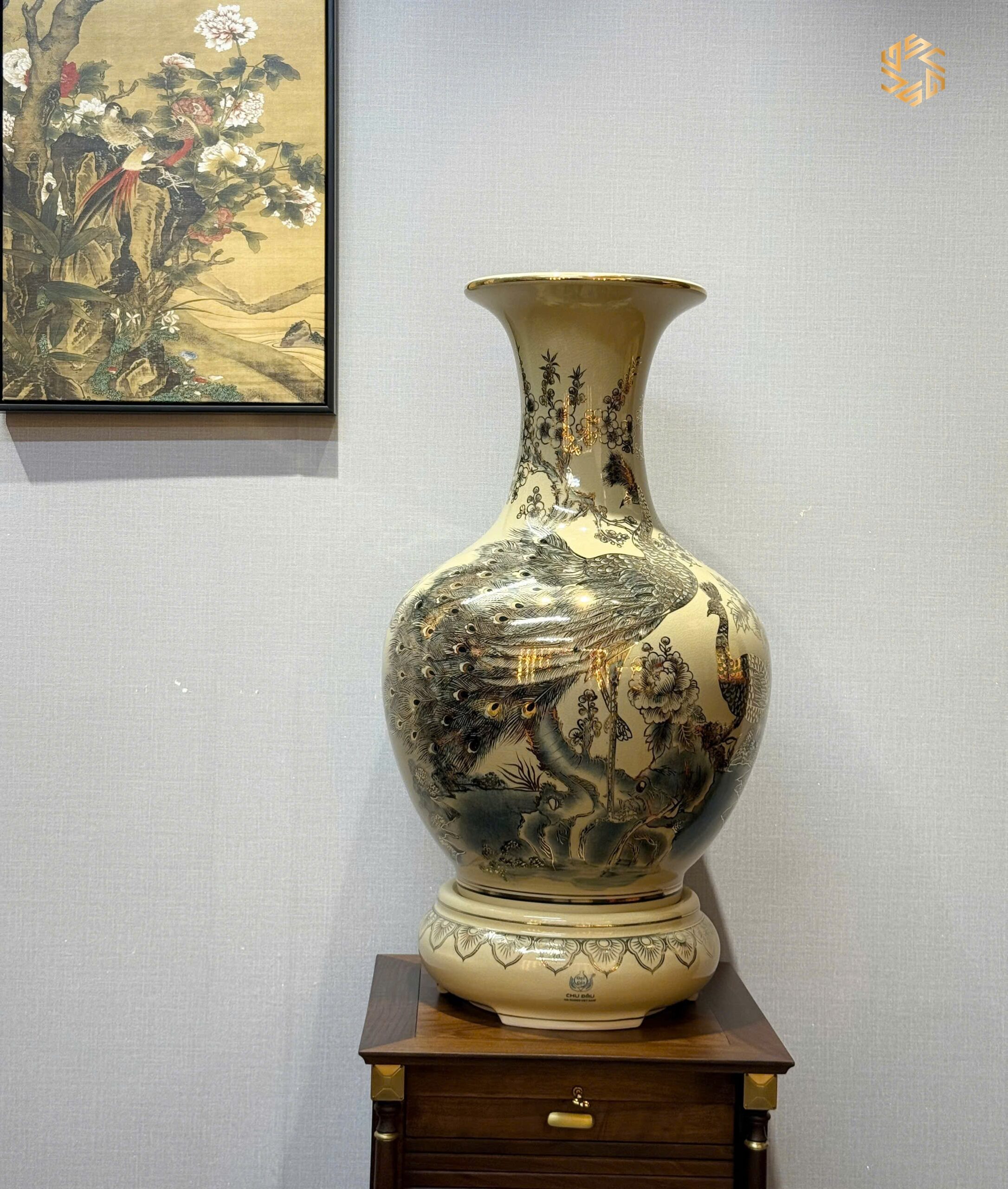 Bình Phú Quý Gốm Chu Đậu H85 Hoạ Tiết Chim Công Hoa Đào Vẽ Vàng 24K PQCĐ05