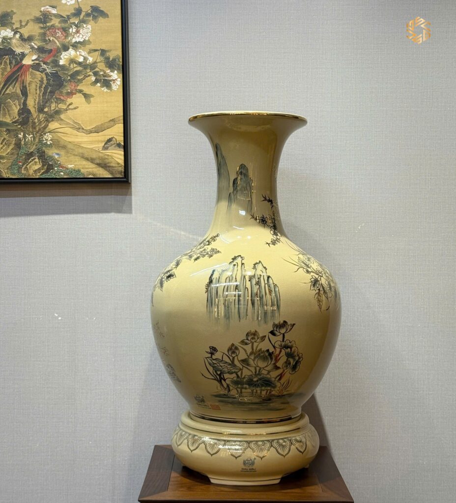 - Chất liệu: Gốm vẽ vàng 24K, thủ công hoàn toàn. Phiên bản nghệ nhân làng nghề GỐM CHU ĐẬU.