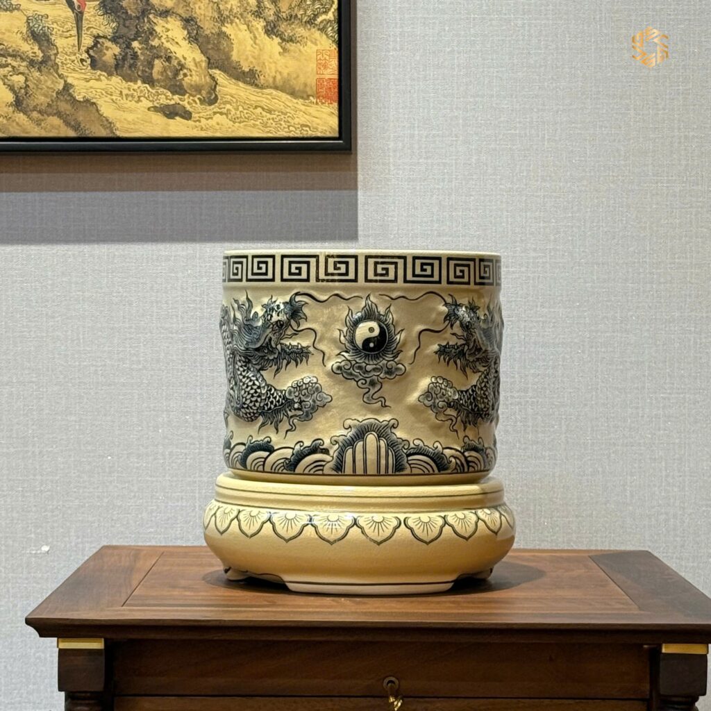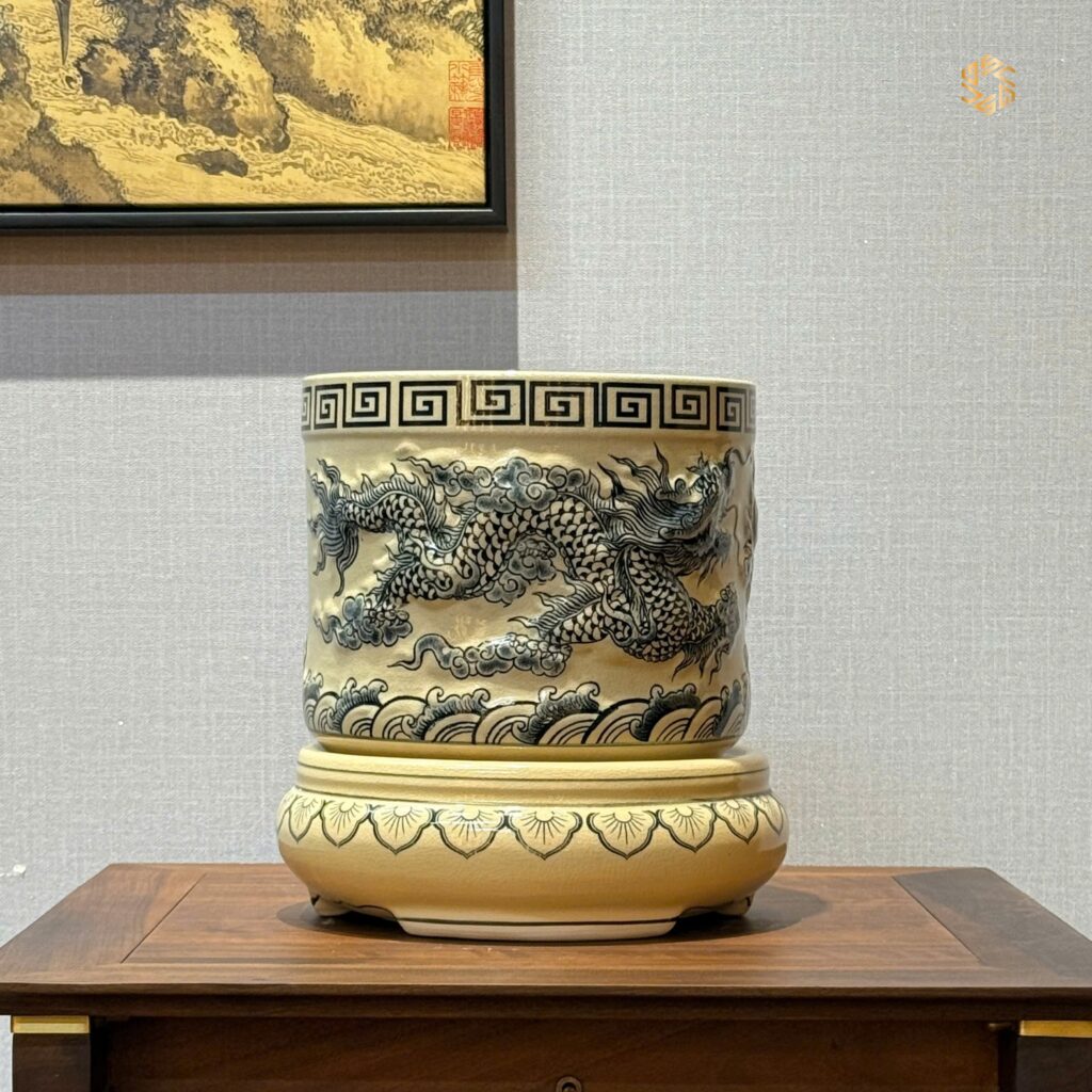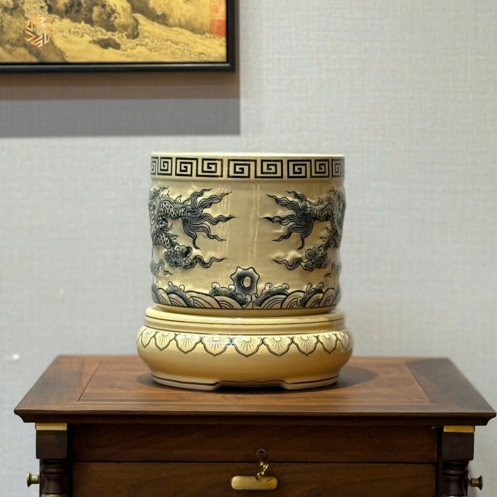 Bát Hương Rồng Nổi Gốm Chu Đậu F22 Men Gốm Truyền Thống