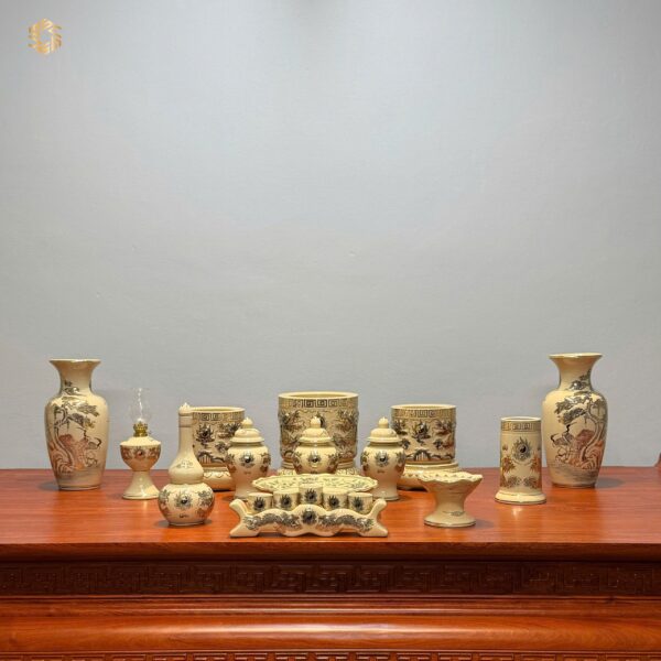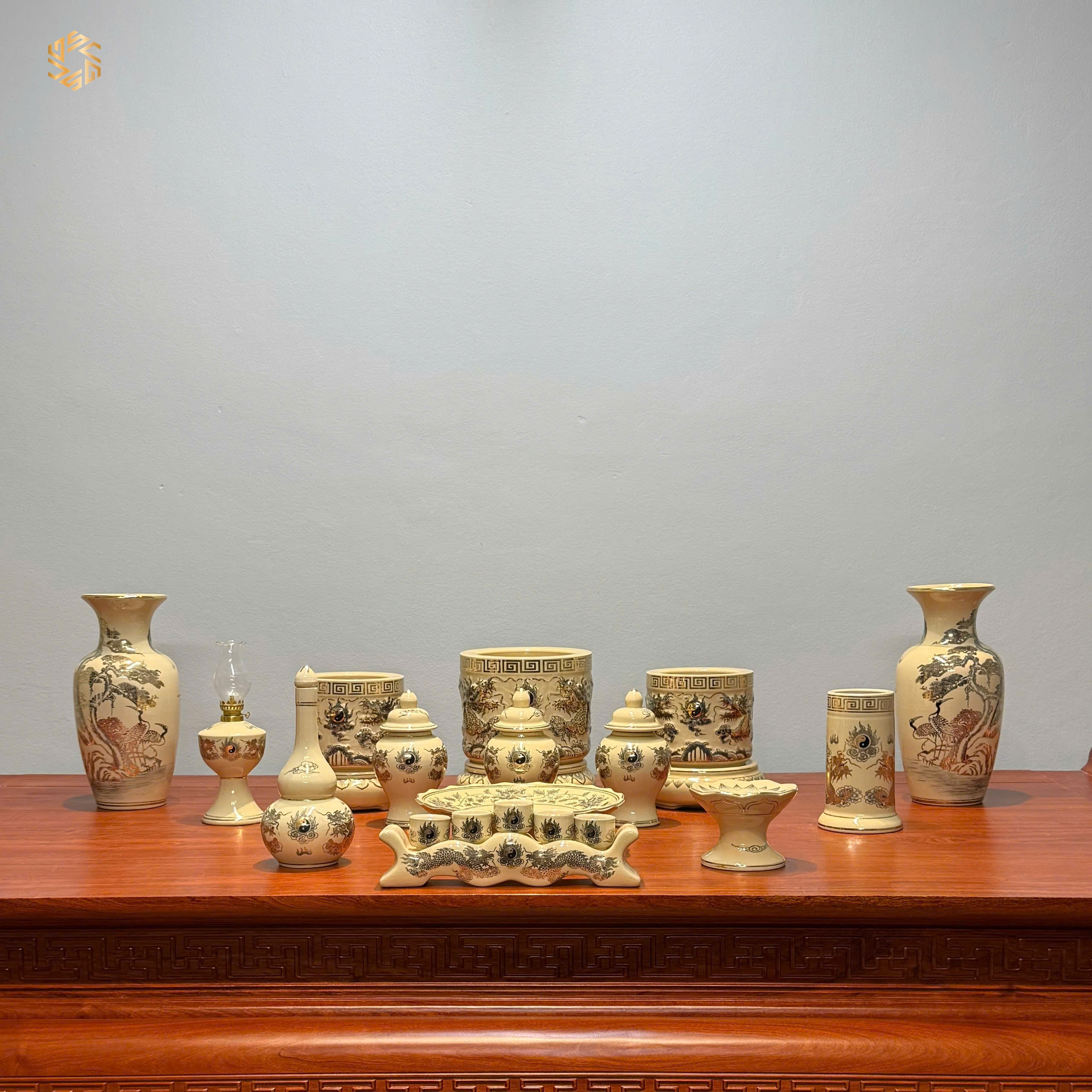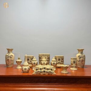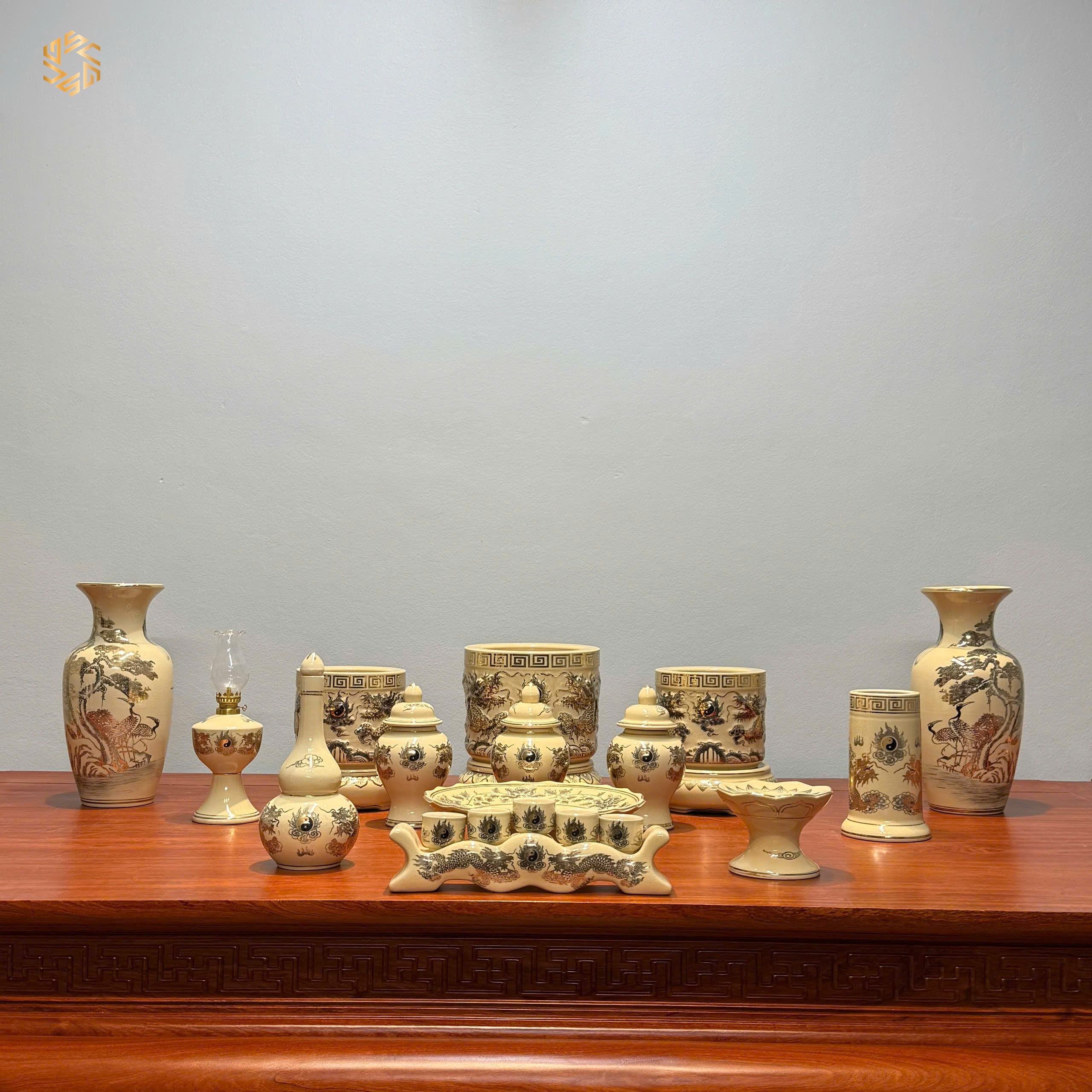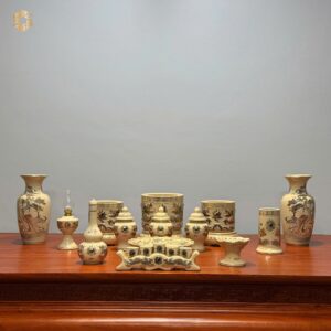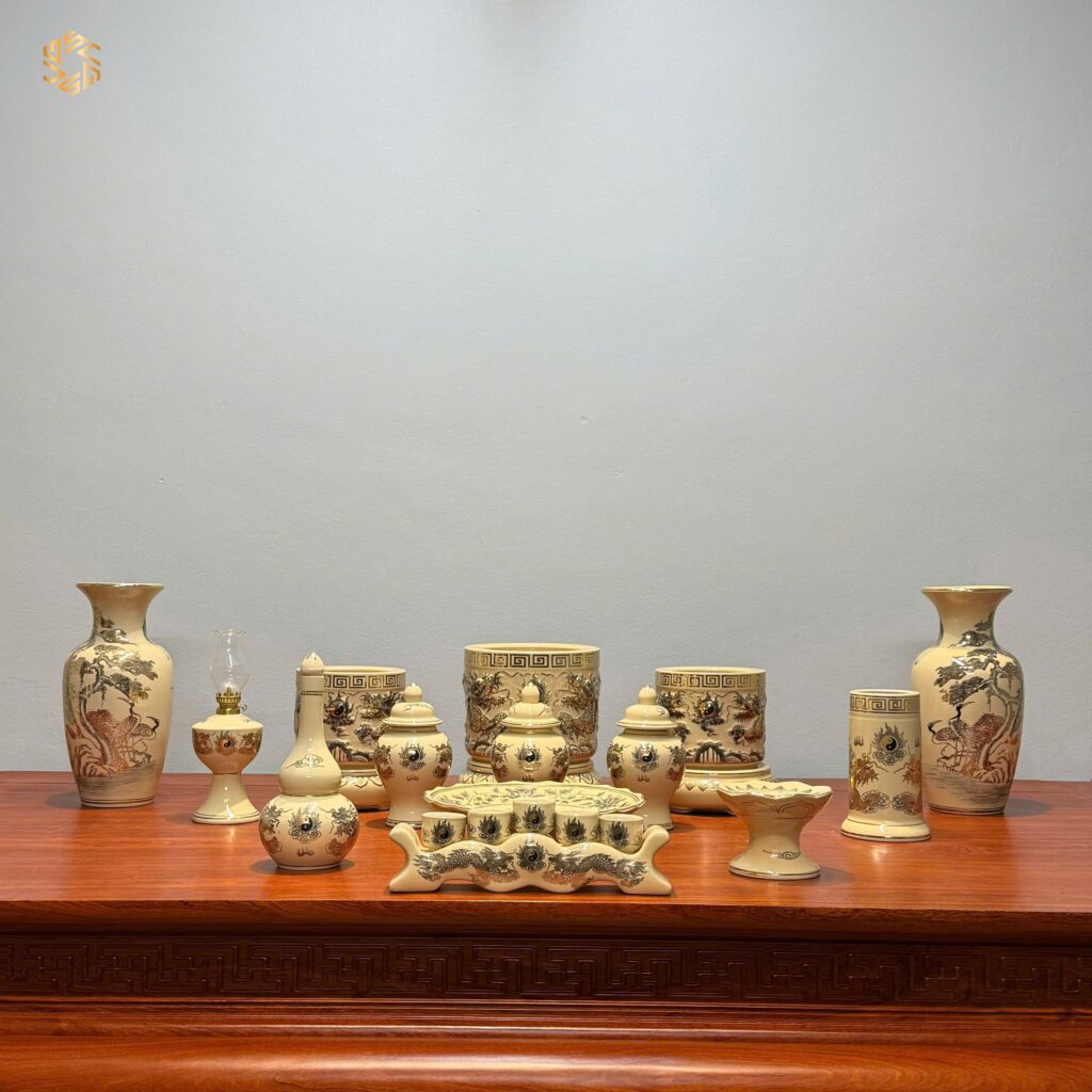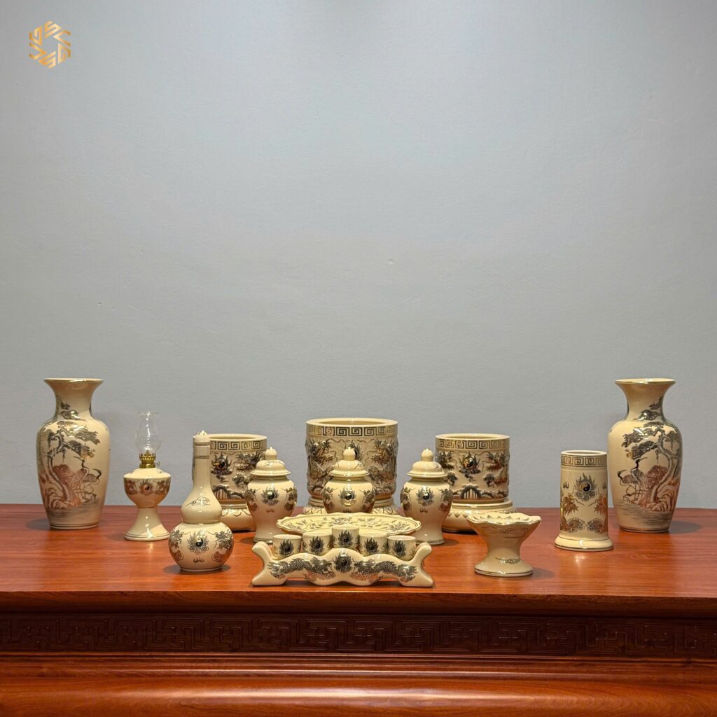 Review Bộ Đồ Thờ Gốm Chu Đậu Bát Hương Rồng Đắp Nổi Vẽ Vàng 24K Ban 117cm – 127cm