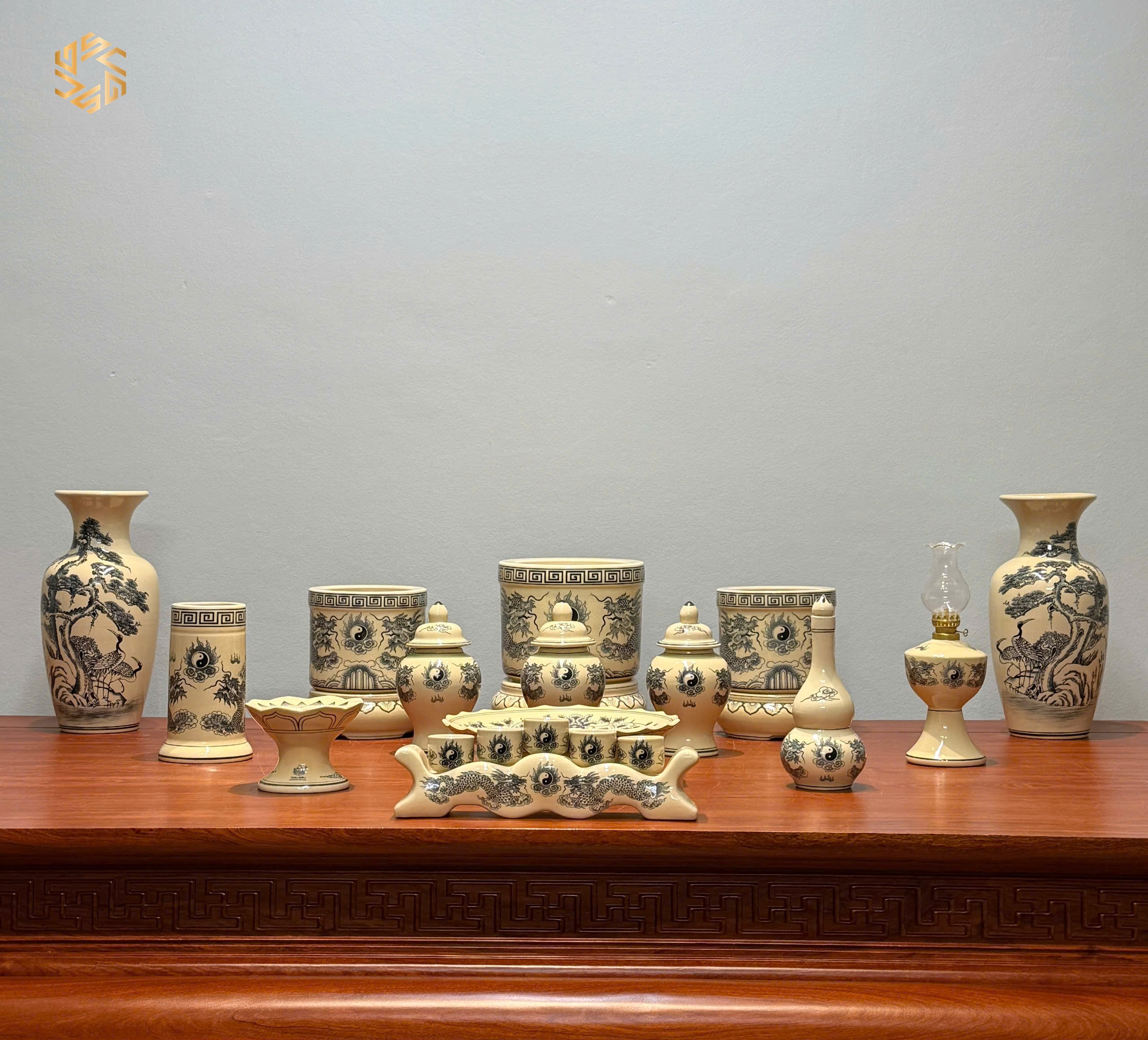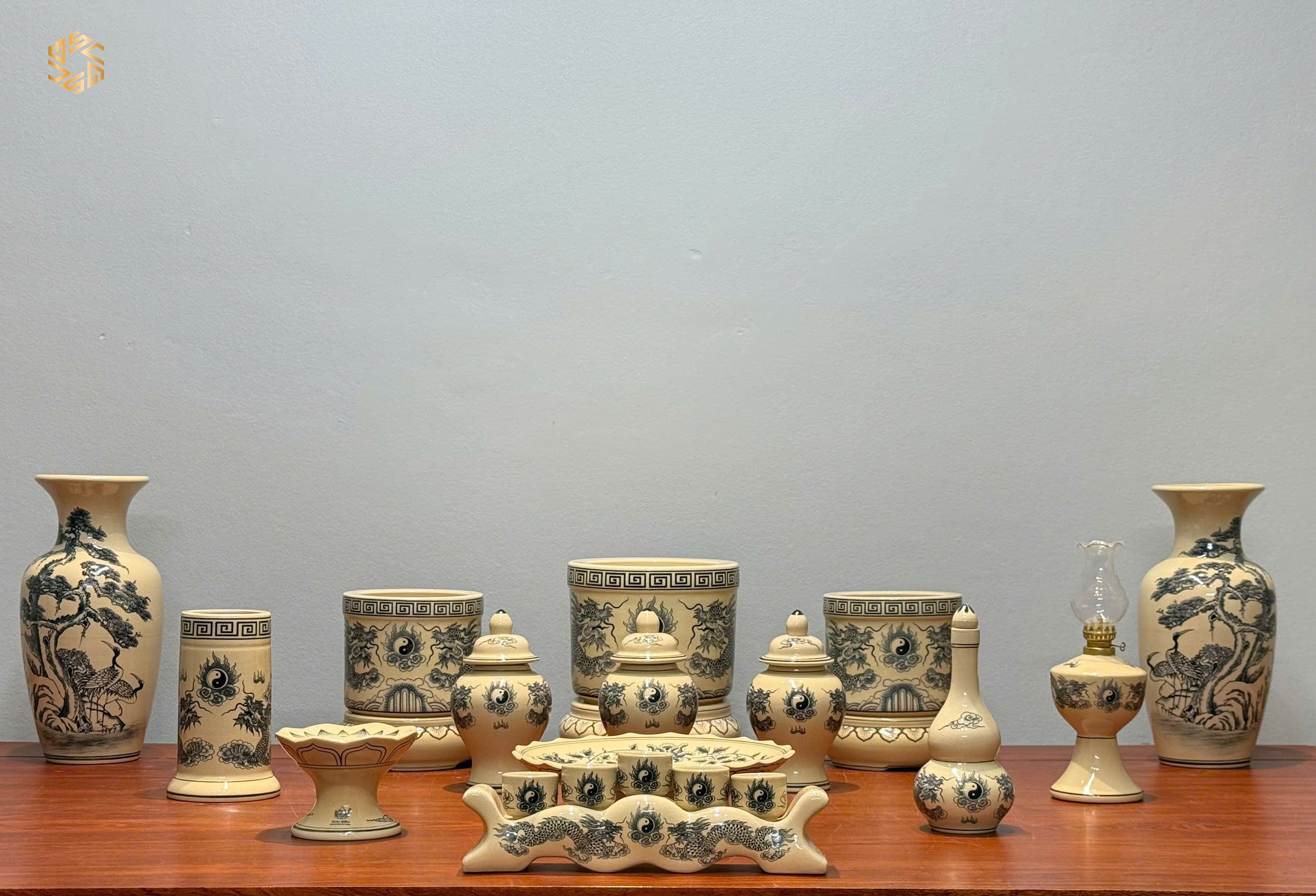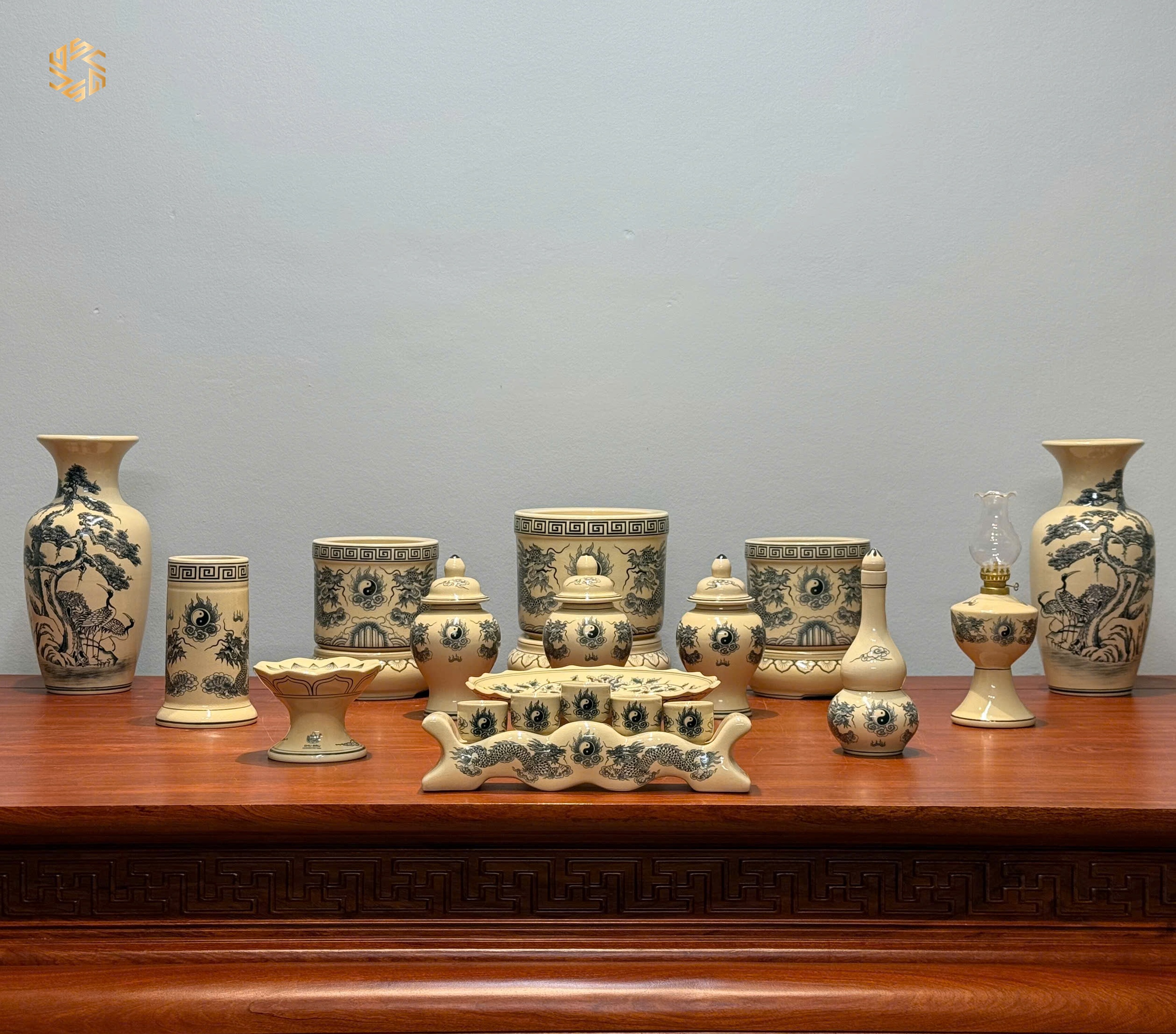 Bộ Đồ Thờ Gốm Chu Đậu Hoạ Tiết Rồng Men Truyền Thống Ban Dài 157cm