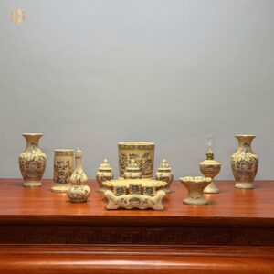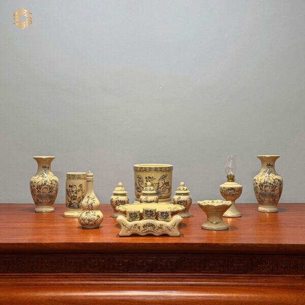 Bộ Đồ Thờ Gốm Chu Đậu Hoạ Tiết Sen Vẽ Vàng 24K Ban 117cm – 127cm