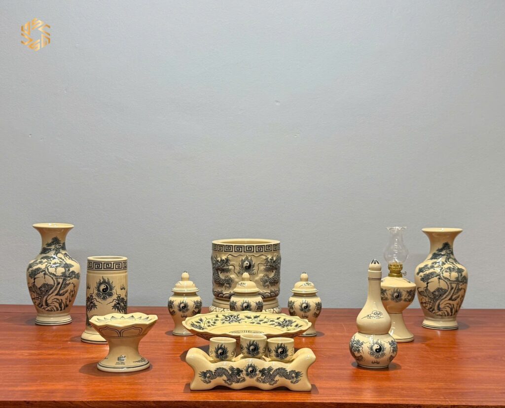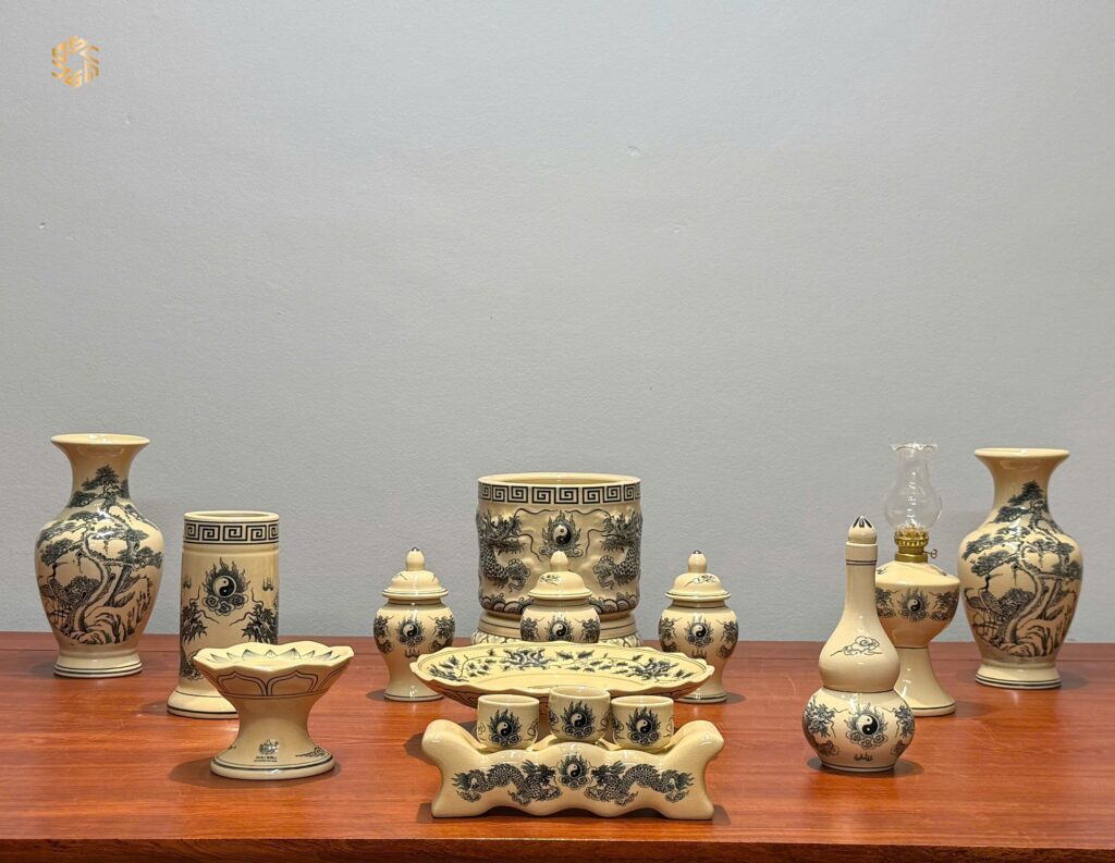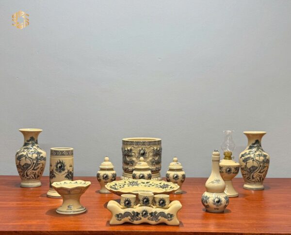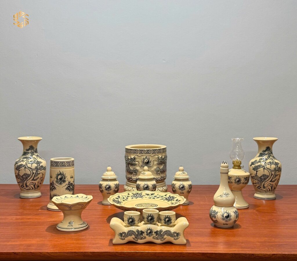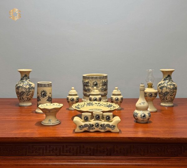 Bộ Đồ Thờ Gốm Chu Đậu Men Truyền Thống Bát Hương Đắp Nổi Tinh Xảo Ban Dài 1m17 – 1m27