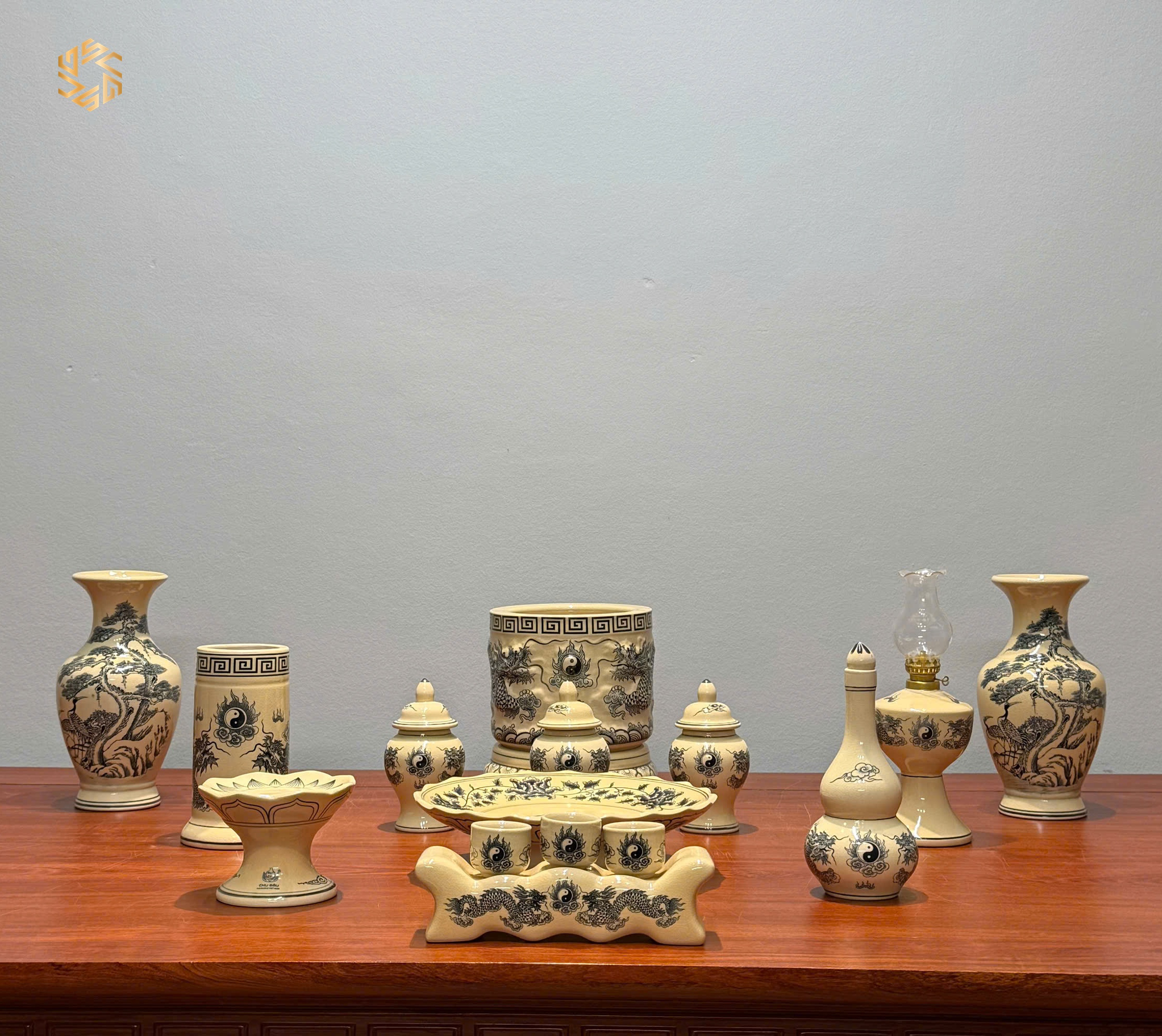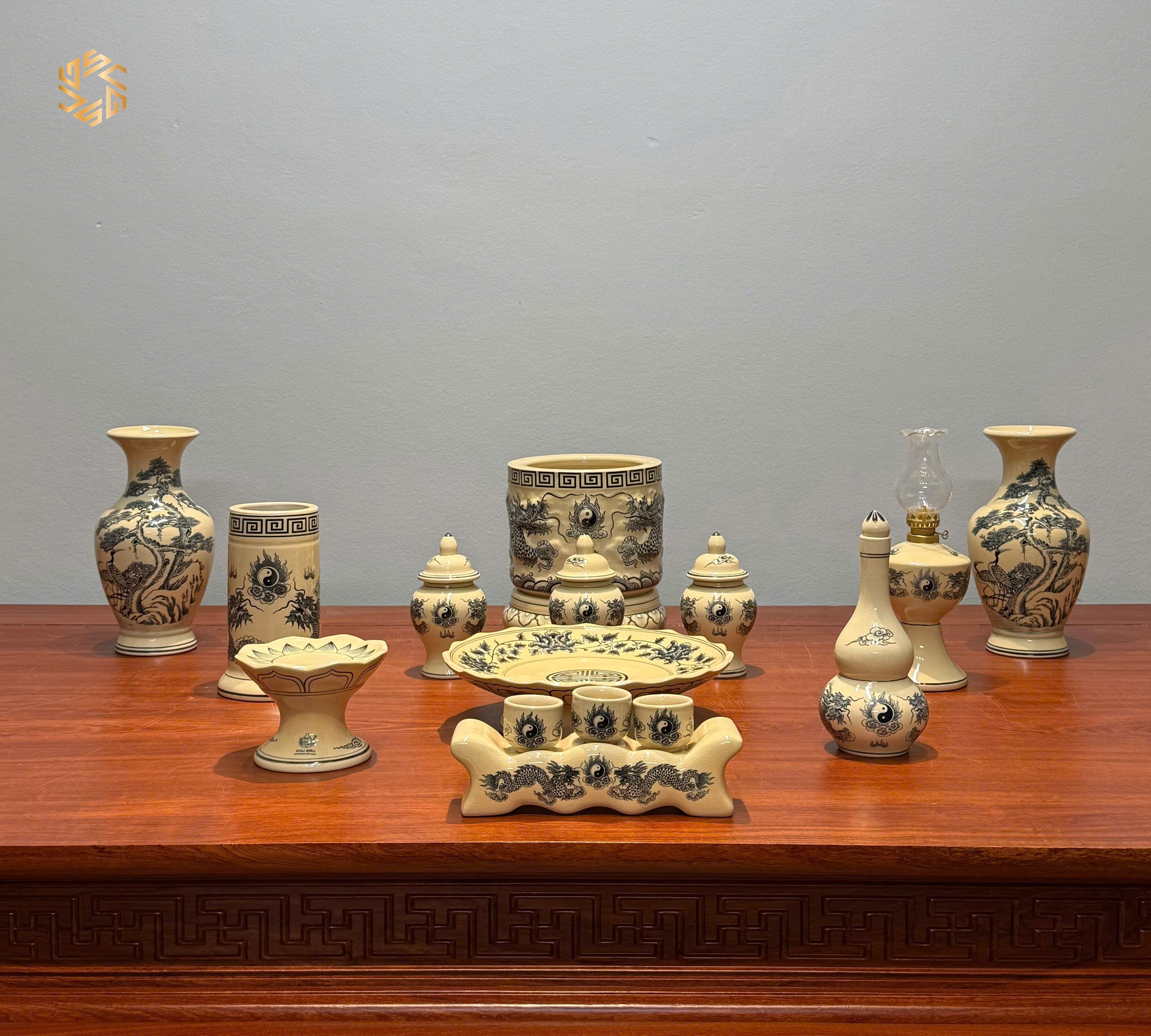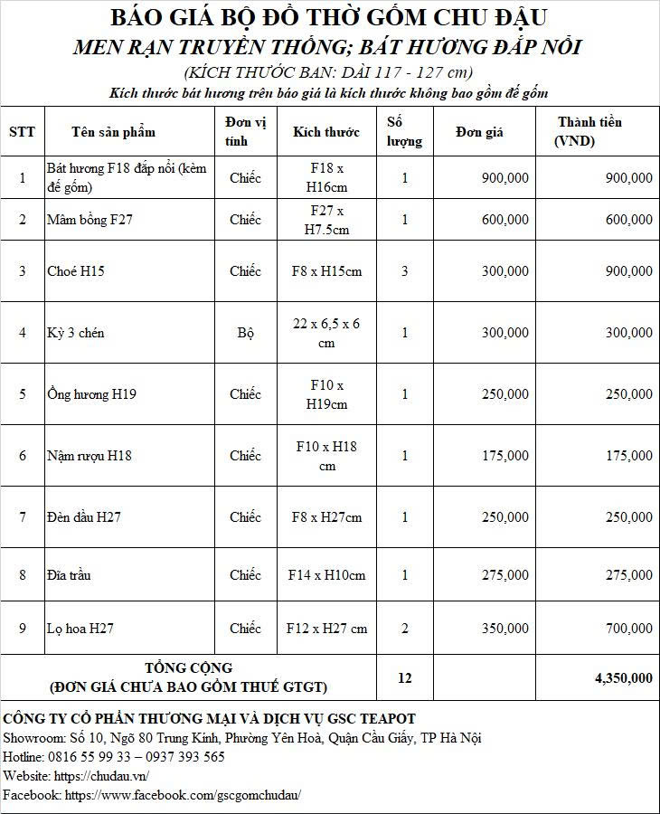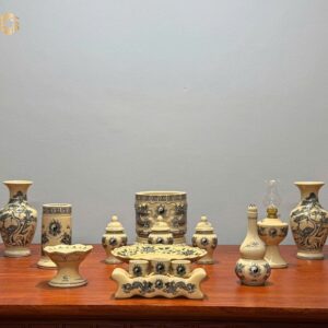 Bộ Đồ Thờ Gốm Chu Đậu Men Truyền Thống Bát Hương Đắp Nổi Tinh Xảo Ban Dài 1m17 – 1m27