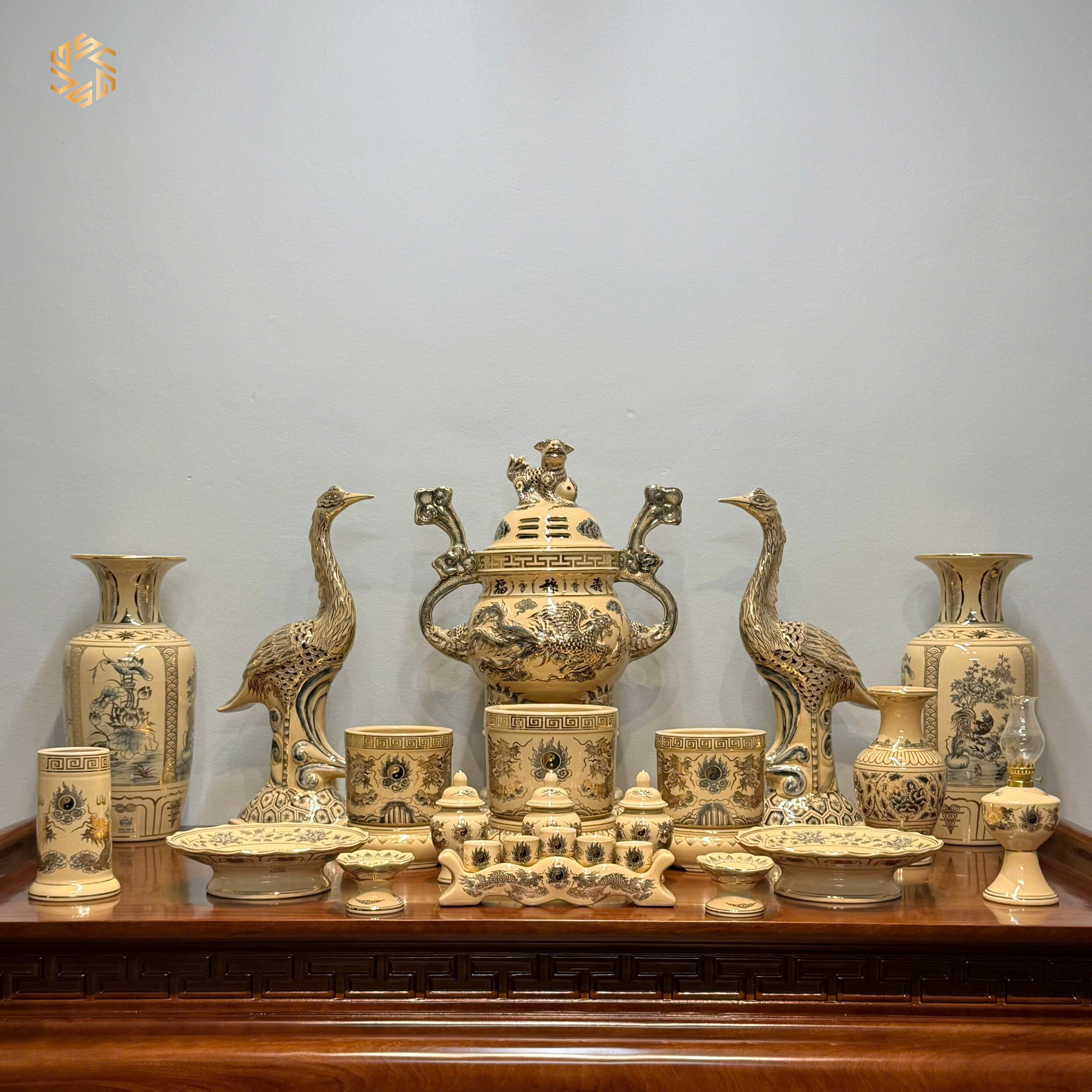 Bộ Đồ Thờ Vẽ Vàng 24K Bát Hương Rồng Kết Hợp Đỉnh Hạc Tứ Linh Tinh Xảo Ban 175cm – 217cm