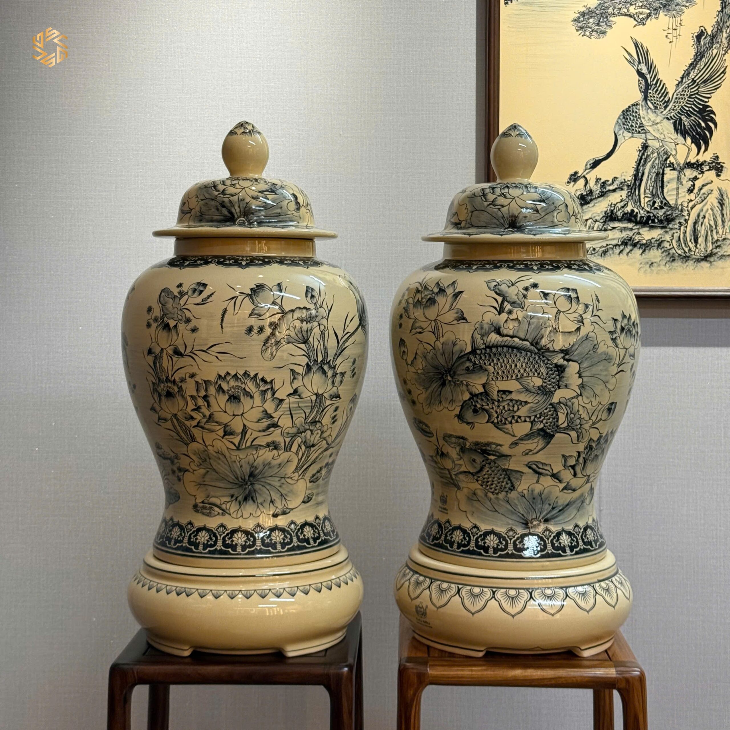 Cặp Choé H60 Hoa Sen Cá Chép Men Gốm Truyền Thống