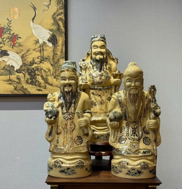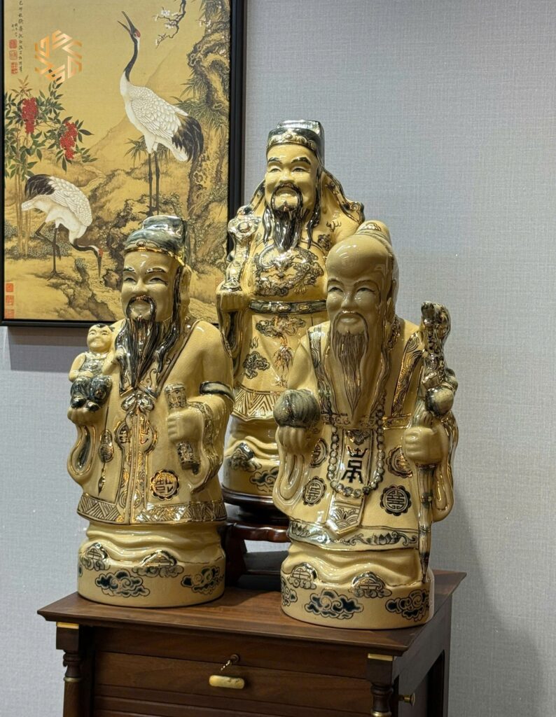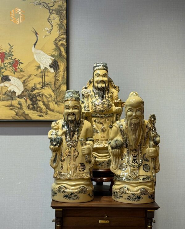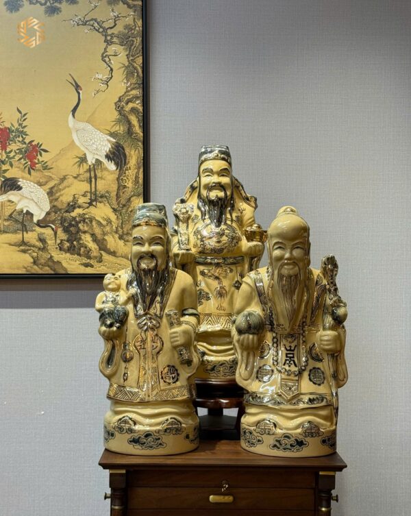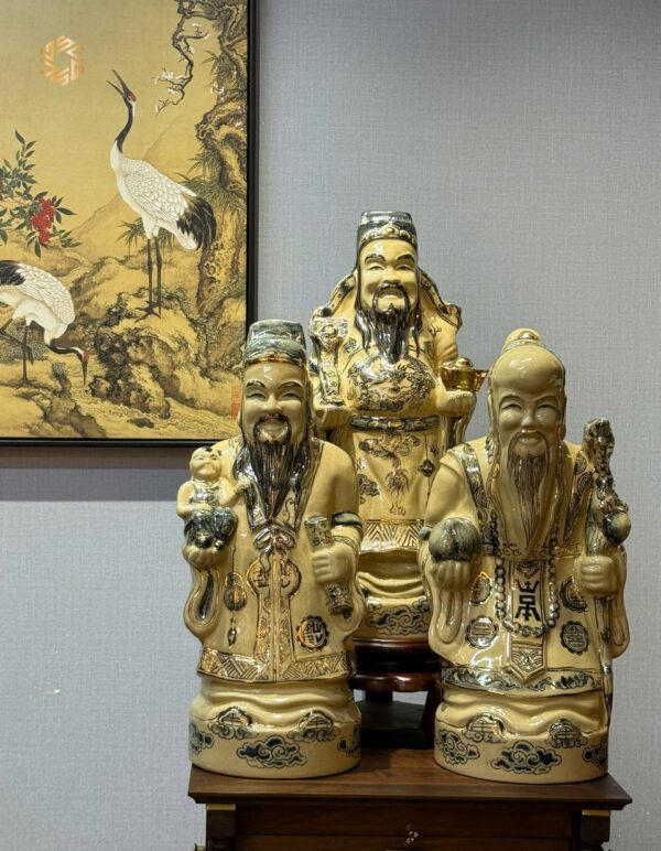 Bộ ba này đại diện cho mong ước toàn diện về một cuộc sống sung túc, đủ đầy: con cháu, tiền tài và sức khỏe.