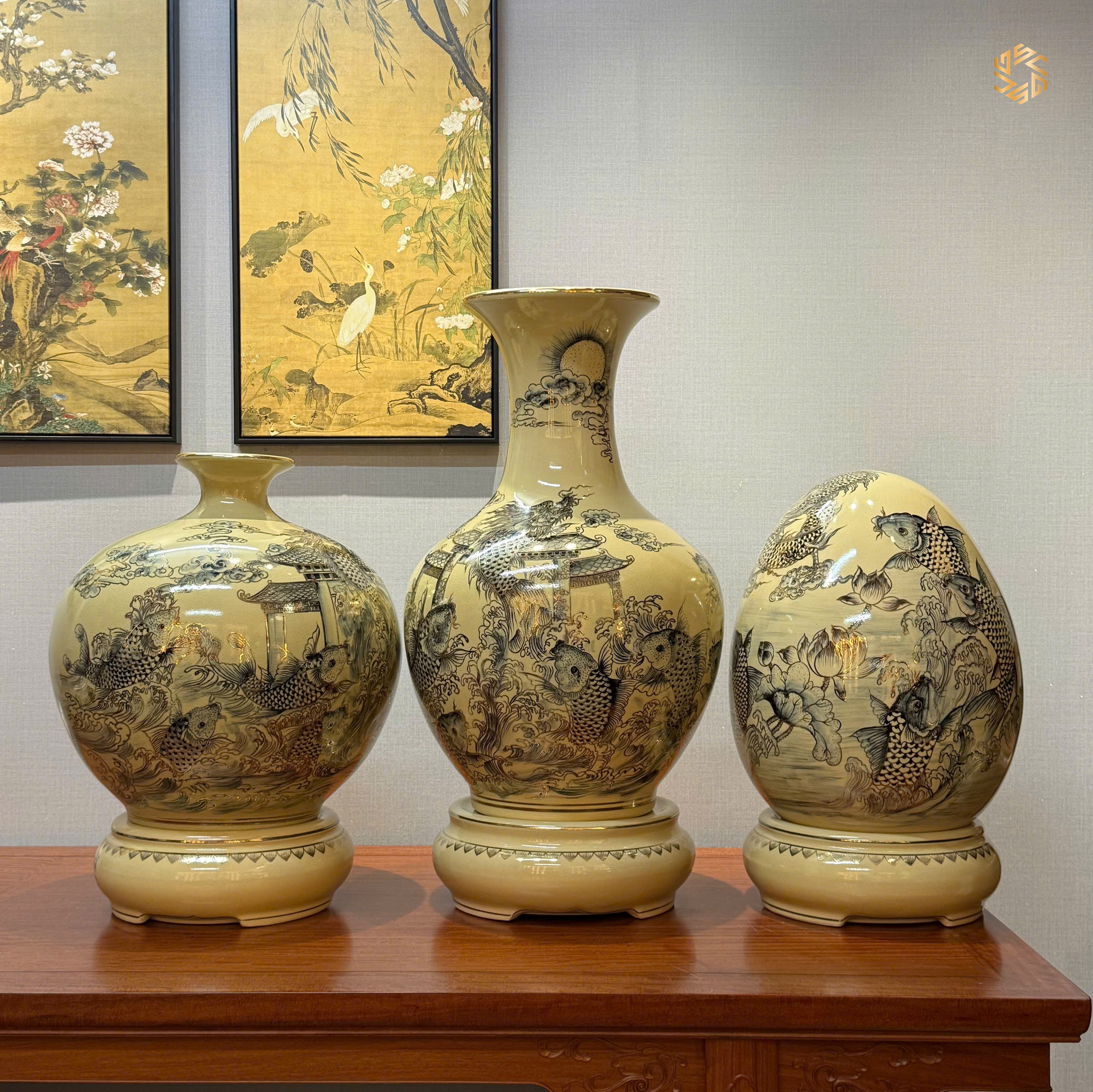 Combo Trứng Tài Lộc H45 & Bình Hút Lộc H45 & Bình Phú Quý H65 Cá Chép Vượt Vũ Môn Vẽ Vàng 24K