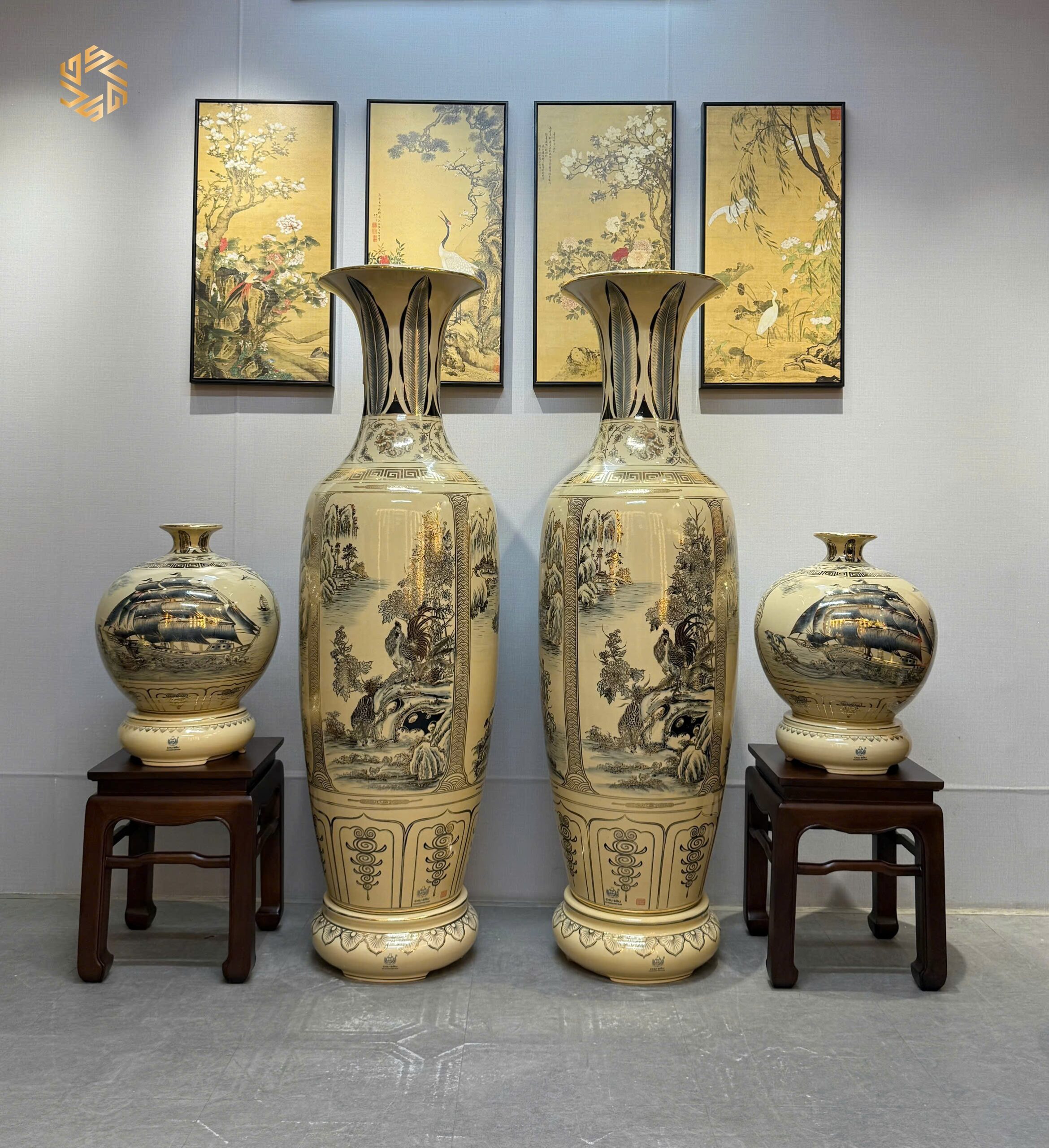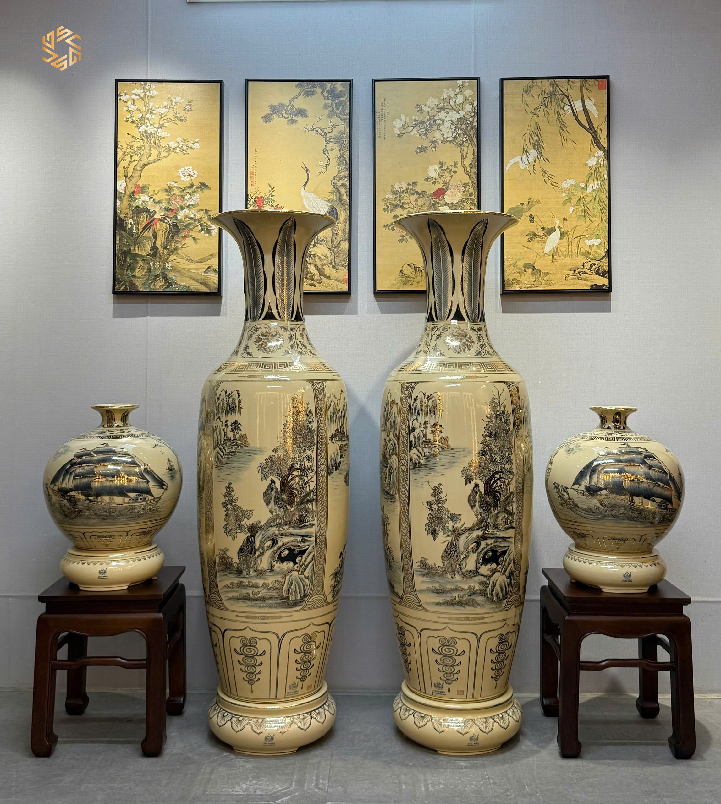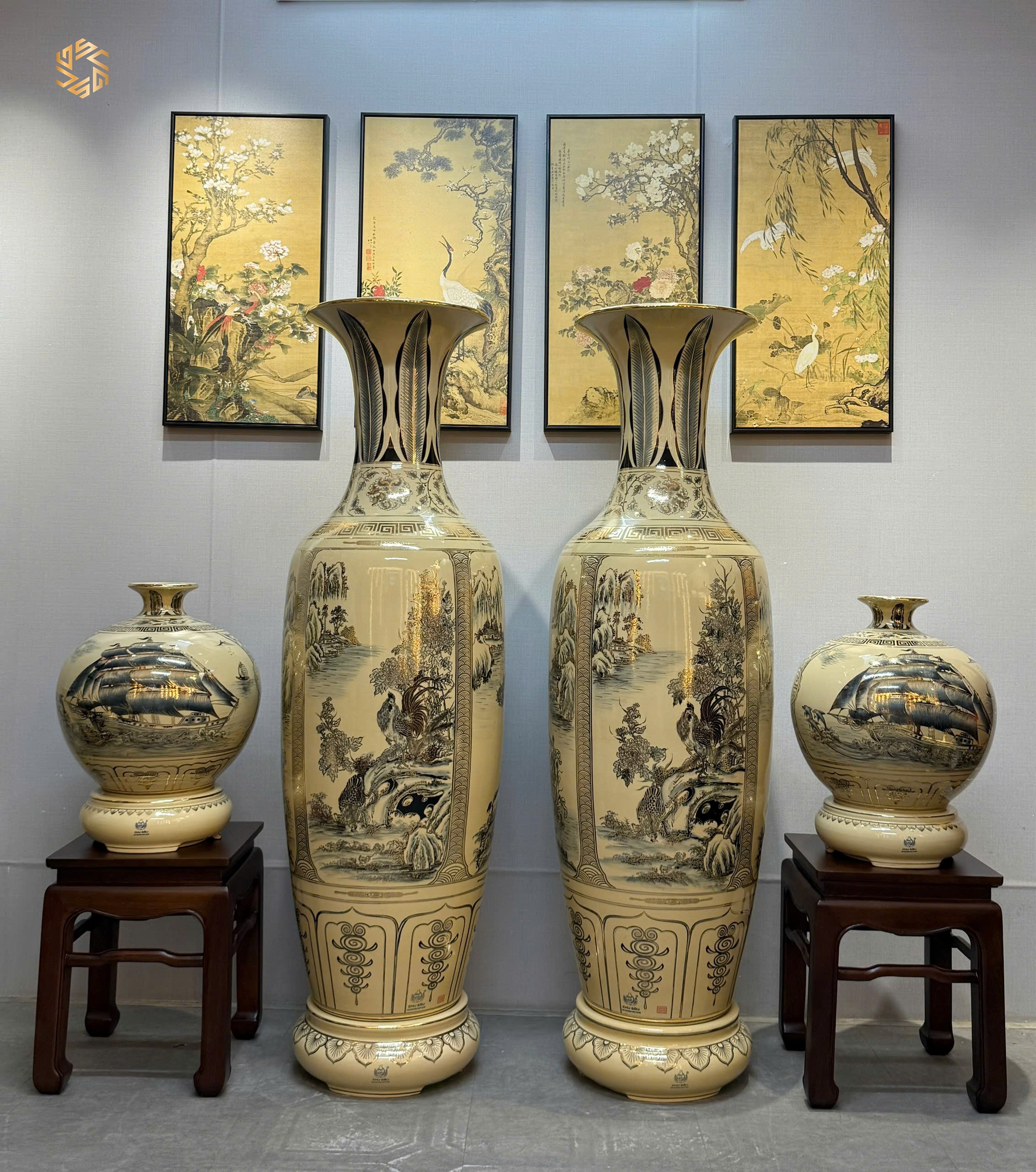 Combo Gốm Chu Đậu Lộc Bình 1M65 Tứ Cảnh Sơn Thuỷ & Bình Hút Lộc H45 24K Tinh Xảo
