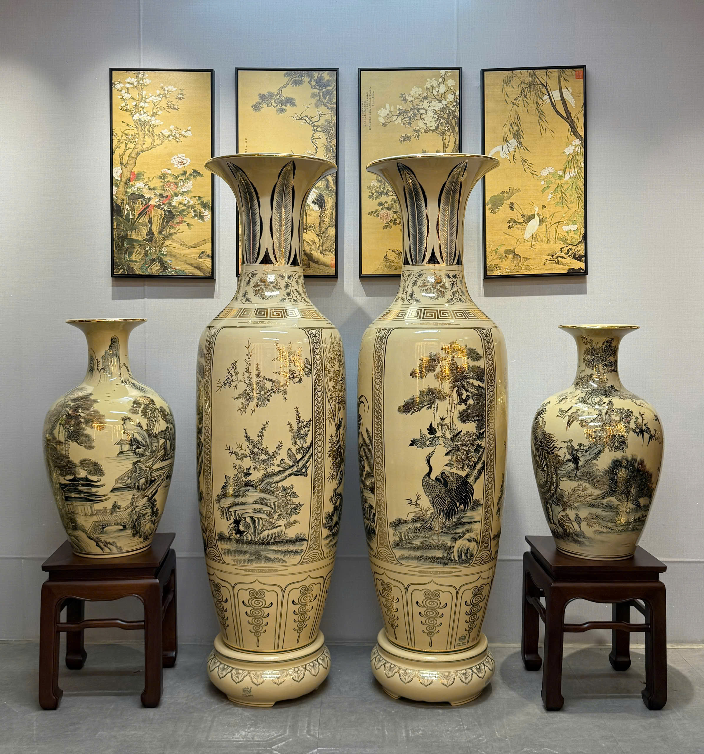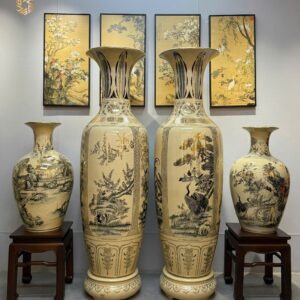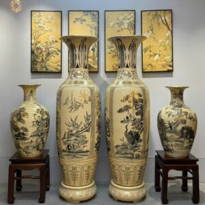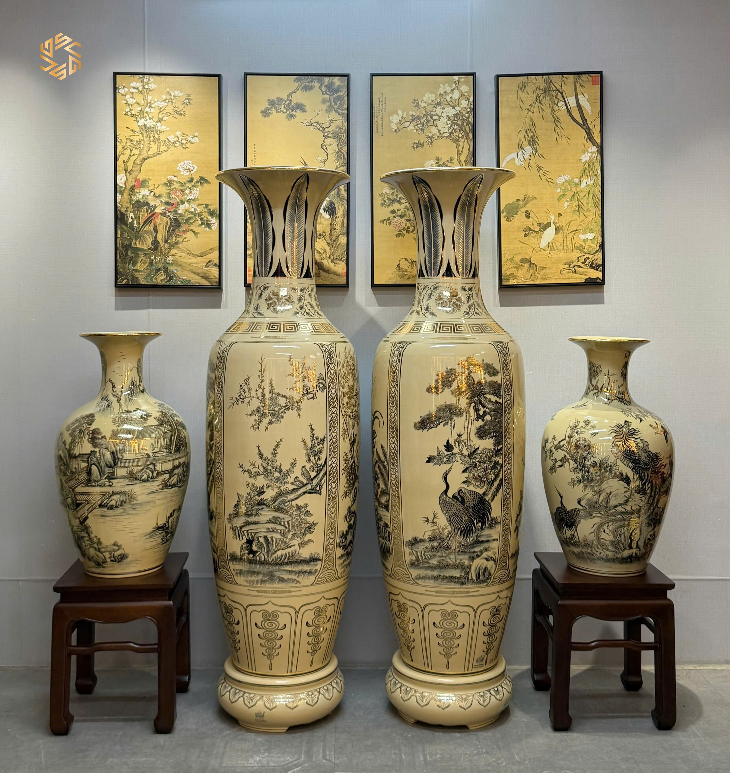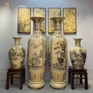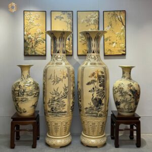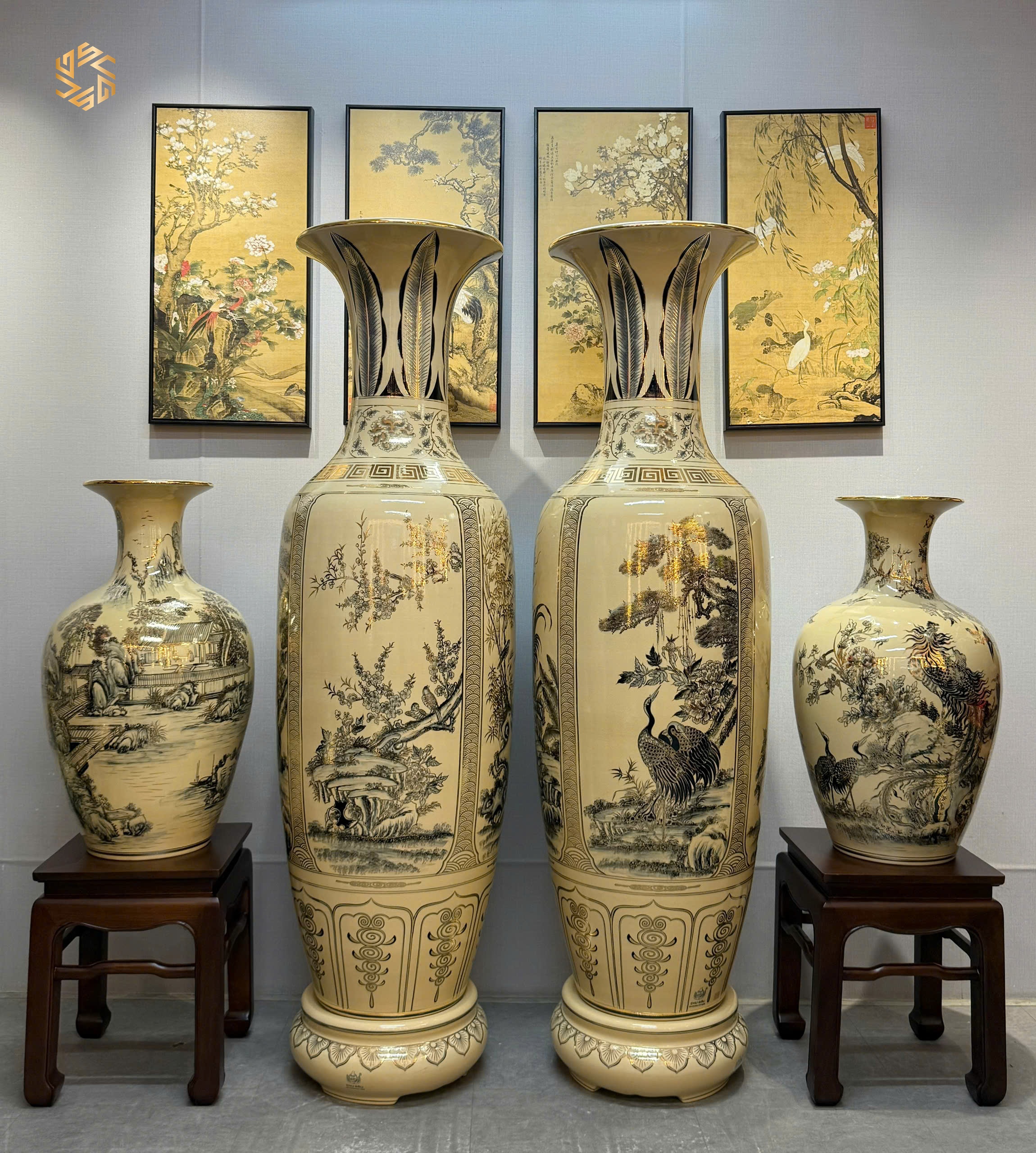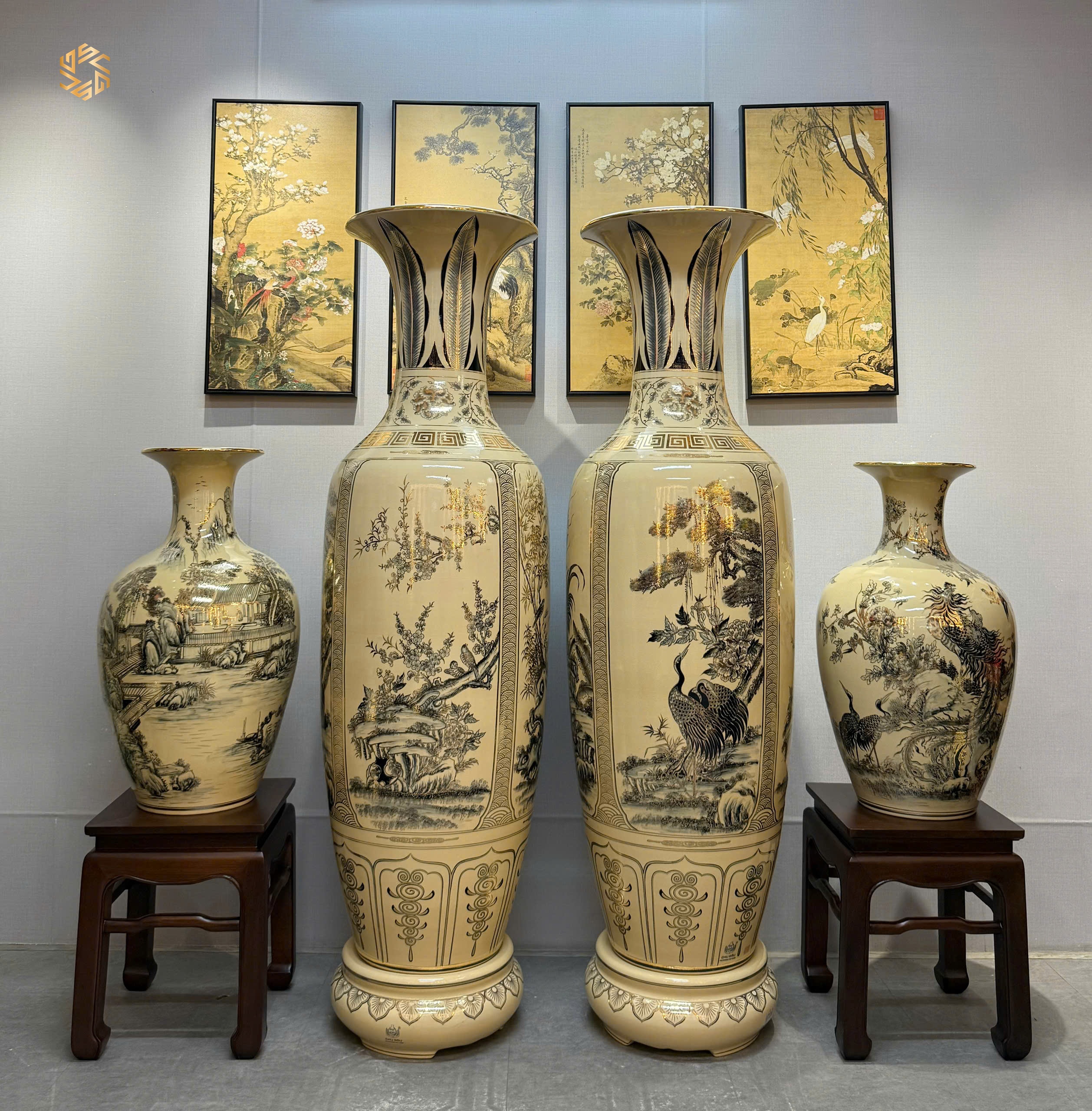 ComBo Lộc Bình 1M75 Gốm Chu Đậu Tứ Cảnh Bốn Mùa & Cặp Bảo Bình H82 Vẽ Vàng 24K Tinh Xảo
