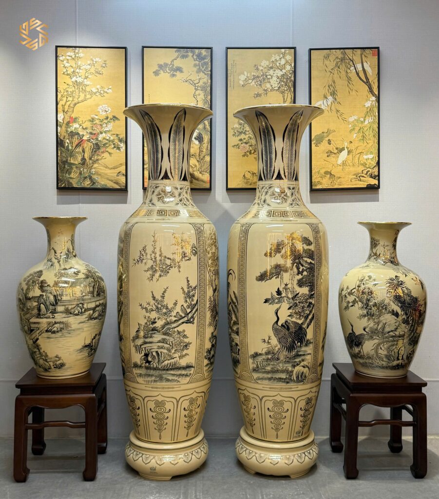 Review ComBo Lộc Bình 1M75 Gốm Chu Đậu Tứ Cảnh Bốn Mùa & Cặp Bảo Bình H82 Vẽ Vàng 24K Tinh Xảo