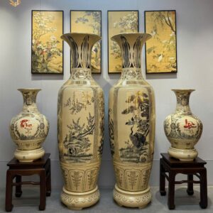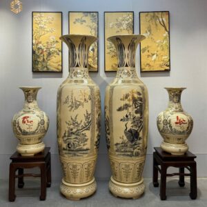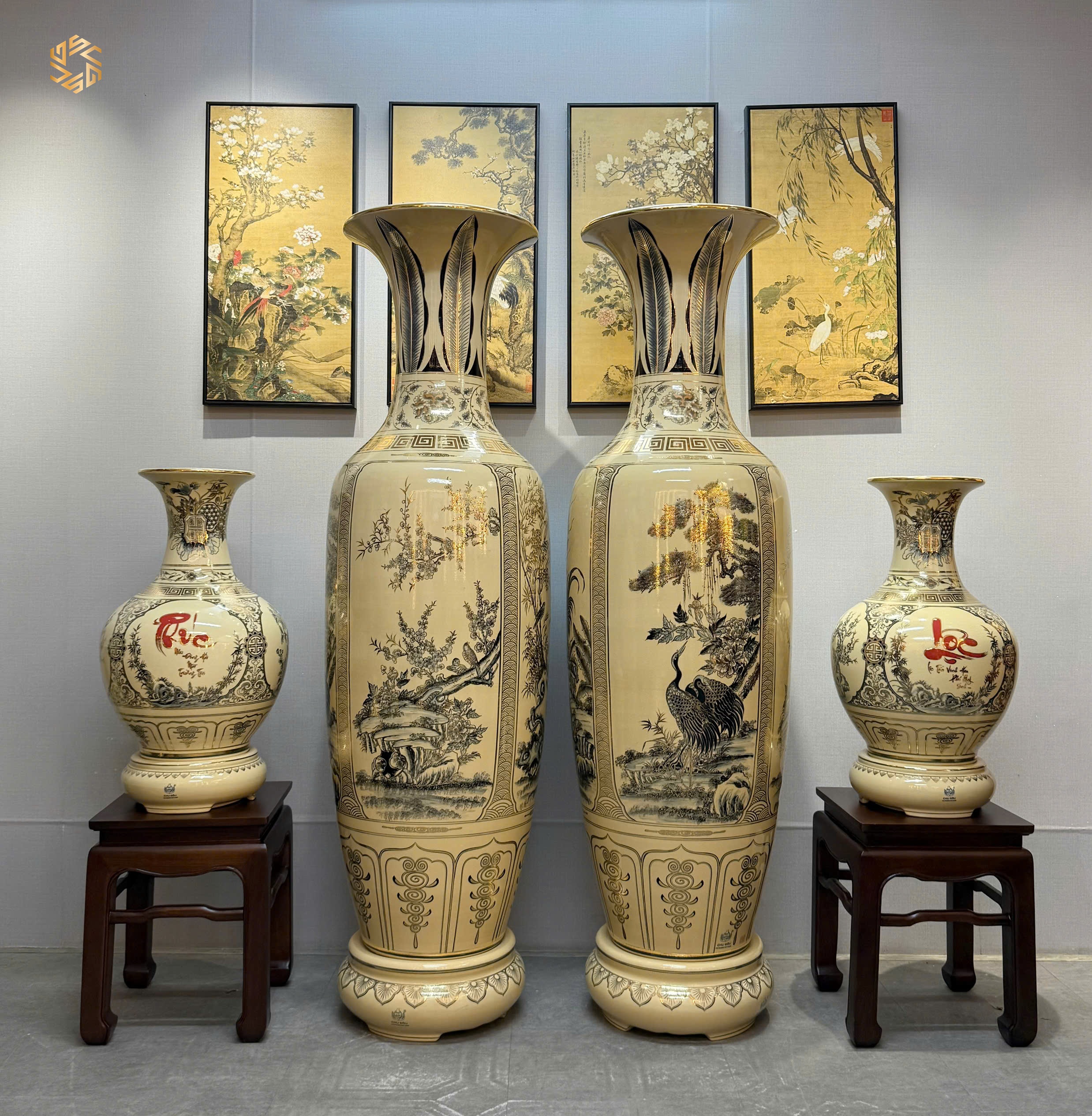 ComBo Lộc Bình 1M75 Gốm Chu Đậu Tứ Cảnh Bốn Mùa & Cặp Bình Phú Quý H65 Vẽ Vàng 24K Tinh Xảo