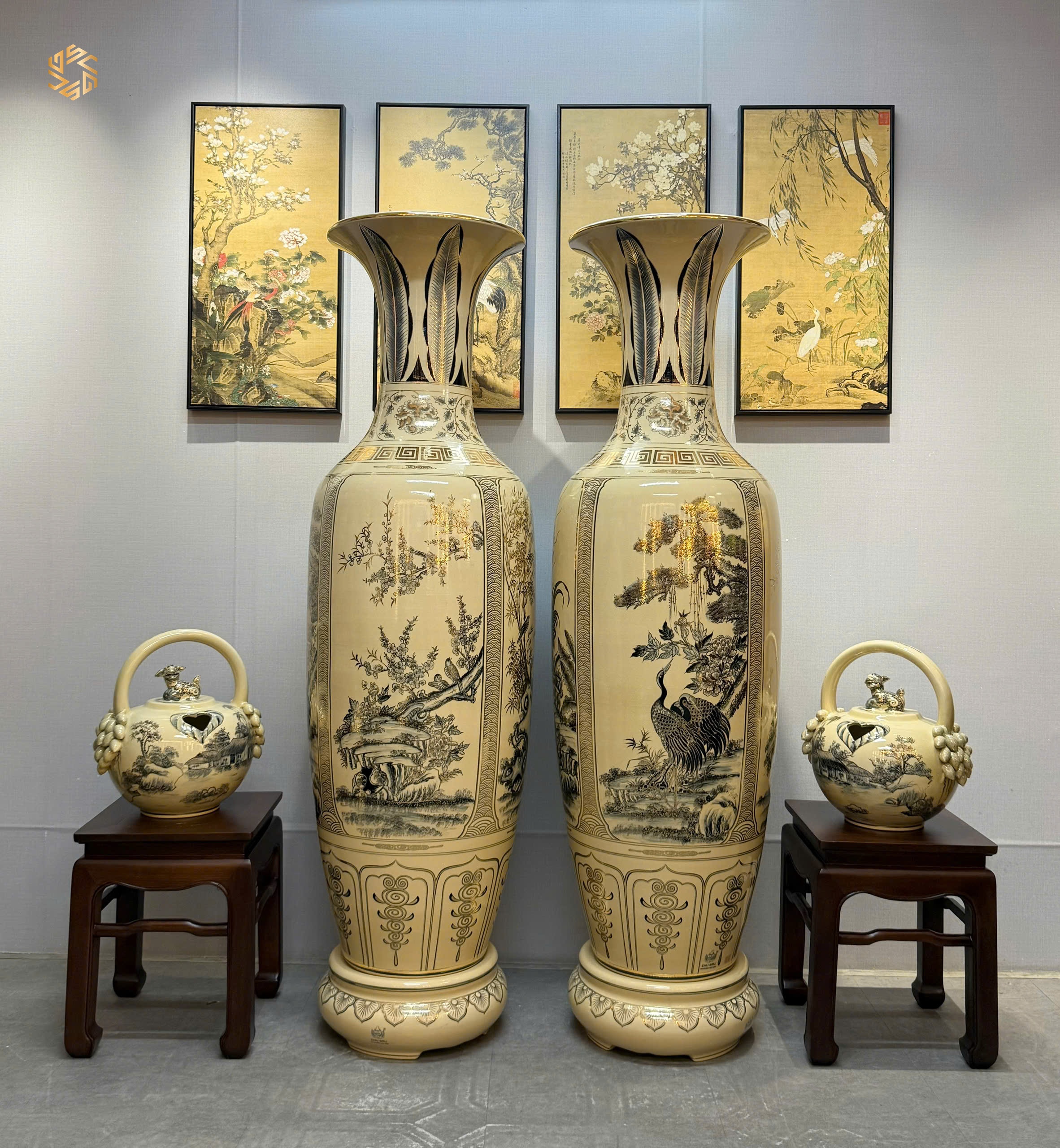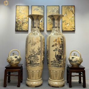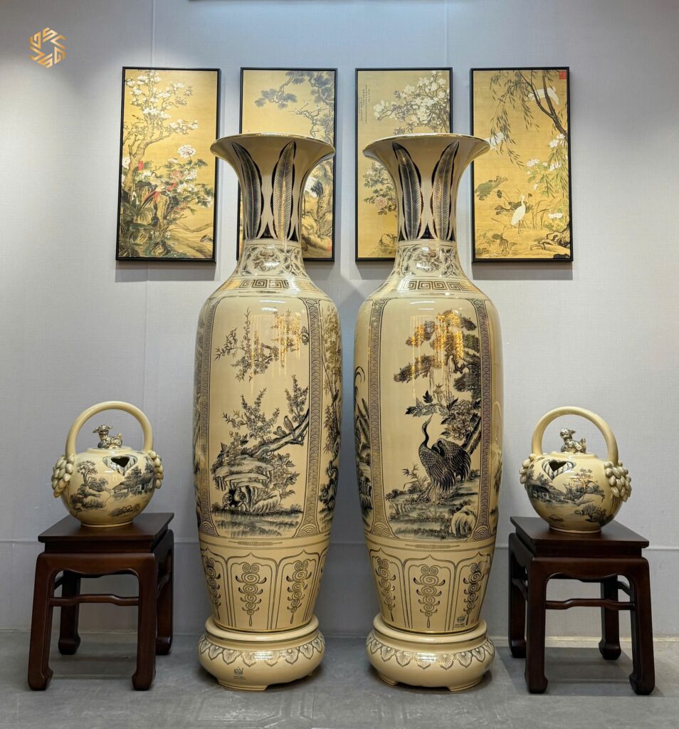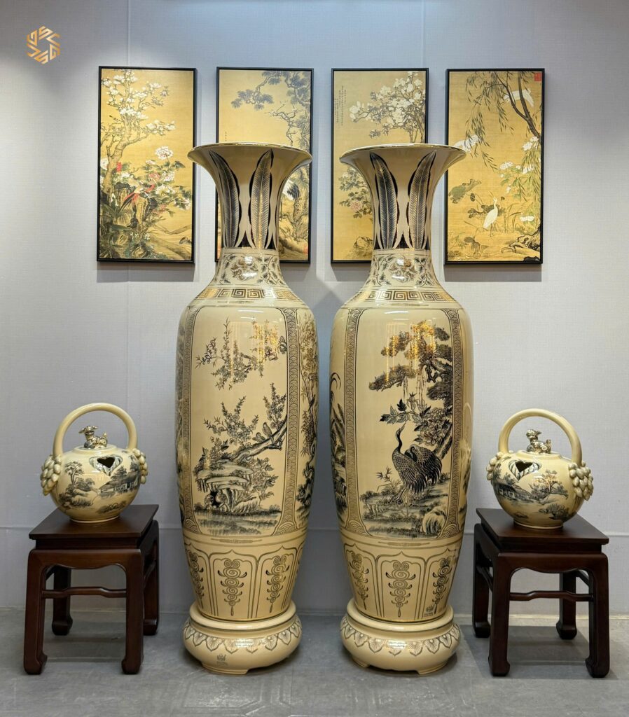 ComBo Lộc Bình 1M75 Gốm Chu Đậu Tứ Cảnh Bốn Mùa & Cặp Bình Vôi Chu Đậu Vẽ Vàng 24K