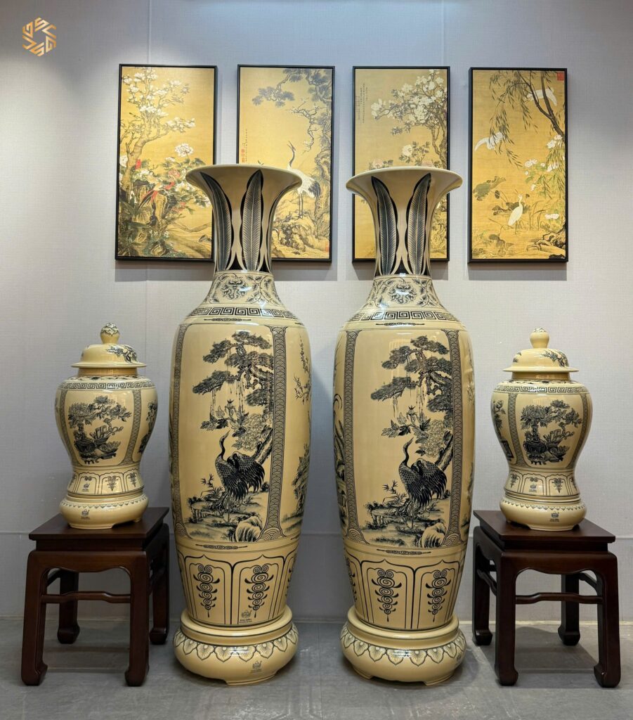 Review ComBo Lộc Bình Gốm Chu Đậu 1M65 Hoạ Tiết Tứ Cảnh Bốn Mùa & Cặp Choé Cổ Đồ Men Gốm Truyền Thống