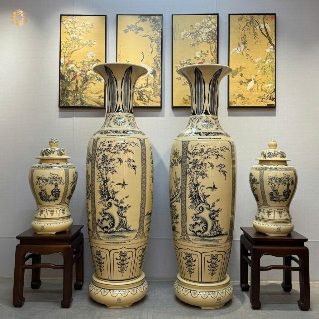 ComBo Lộc Bình Gốm Chu Đậu 1M65 Hoạ Tiết Tứ Cảnh Bốn Mùa & Cặp Choé Cổ Đồ Men Gốm Truyền Thống