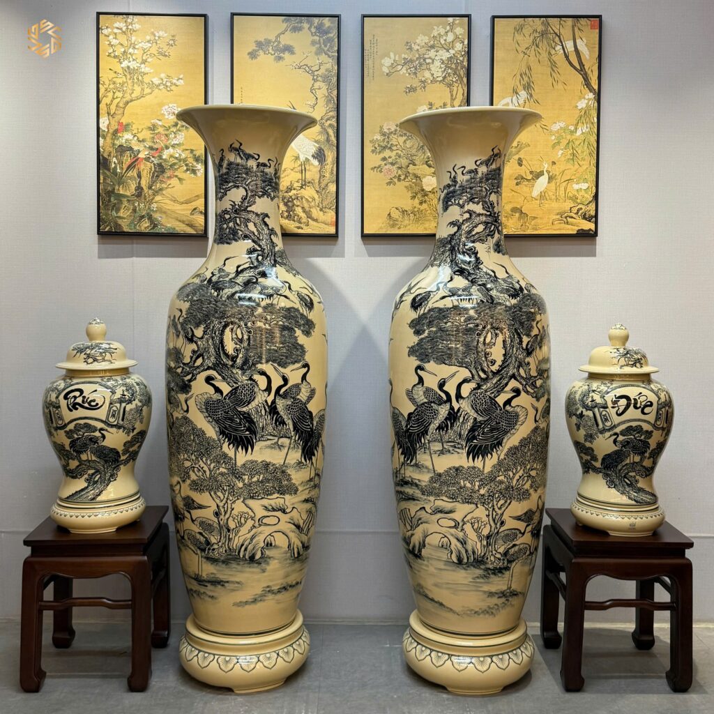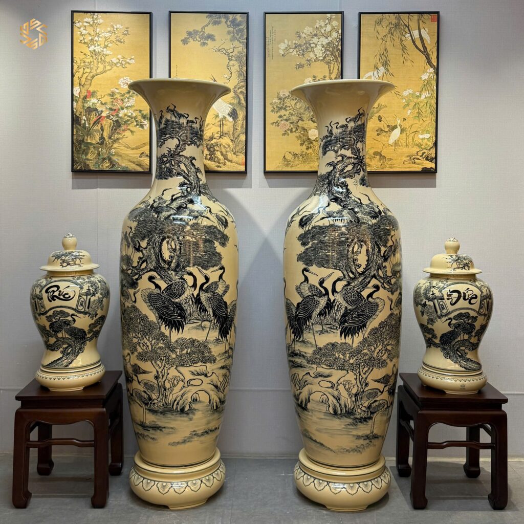 ComBo Lộc Bình Gốm Chu Đậu 1M75 Hoạ Tiết Bách Hạc Quần Tùng & Cặp Choé Phúc Đức H60 Men Gốm Truyền Thống