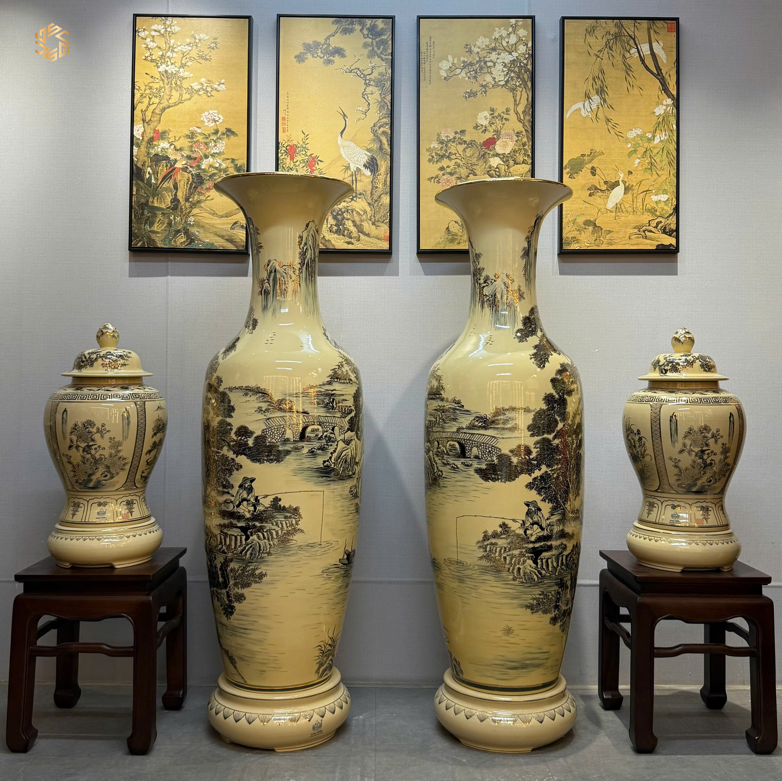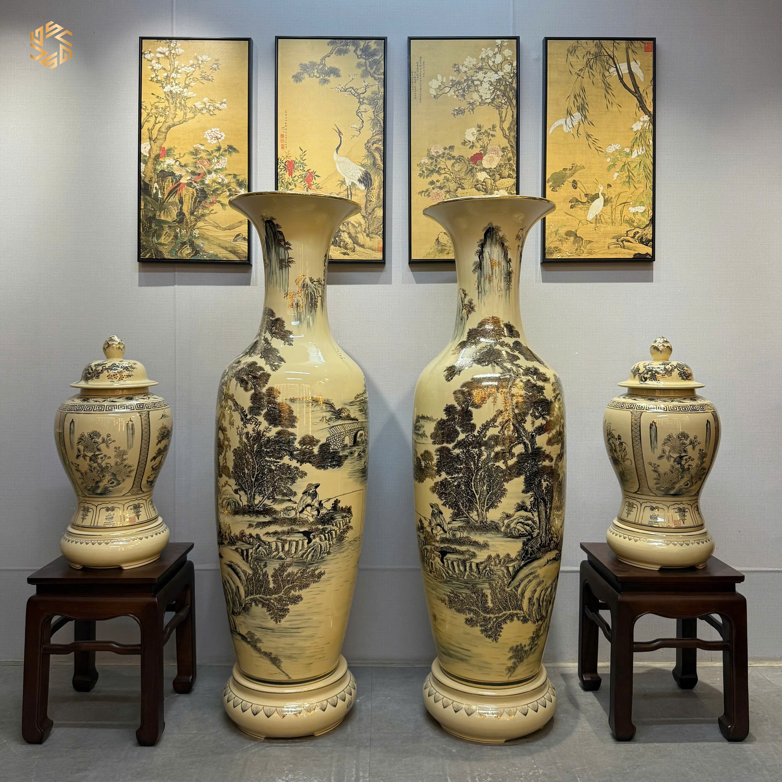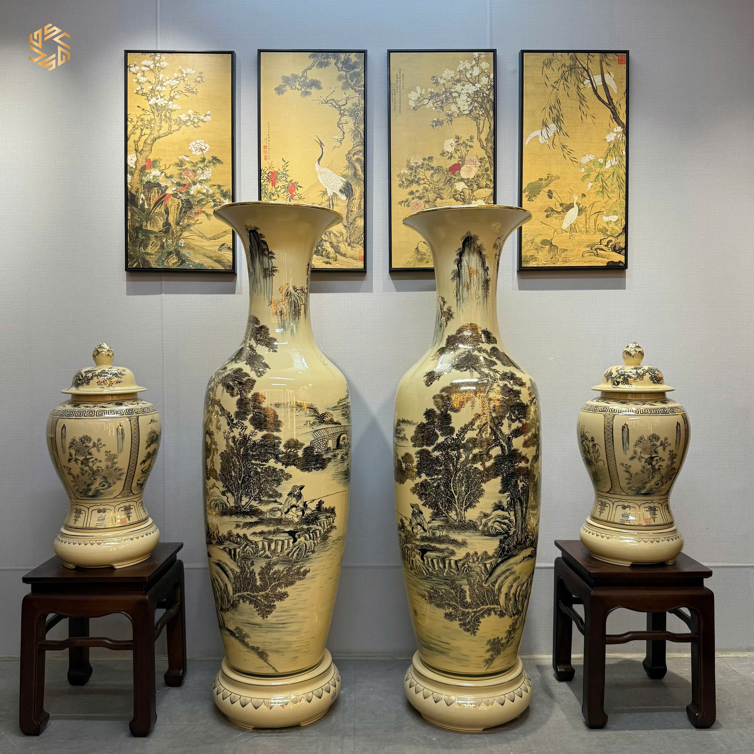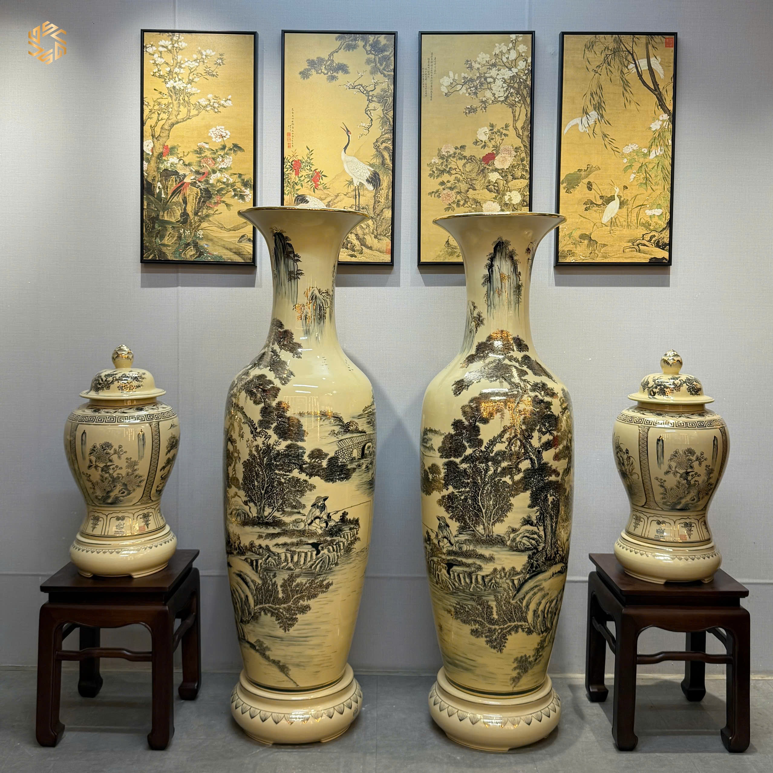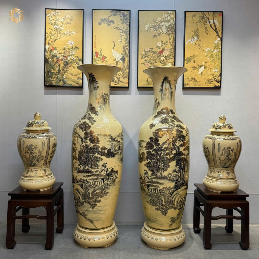 Review Lộc Bình Gốm Chu Đậu 1M55 Sơn Thuỷ Hữu Tình & Cặp Choé H60 Vẽ Vàng 24K