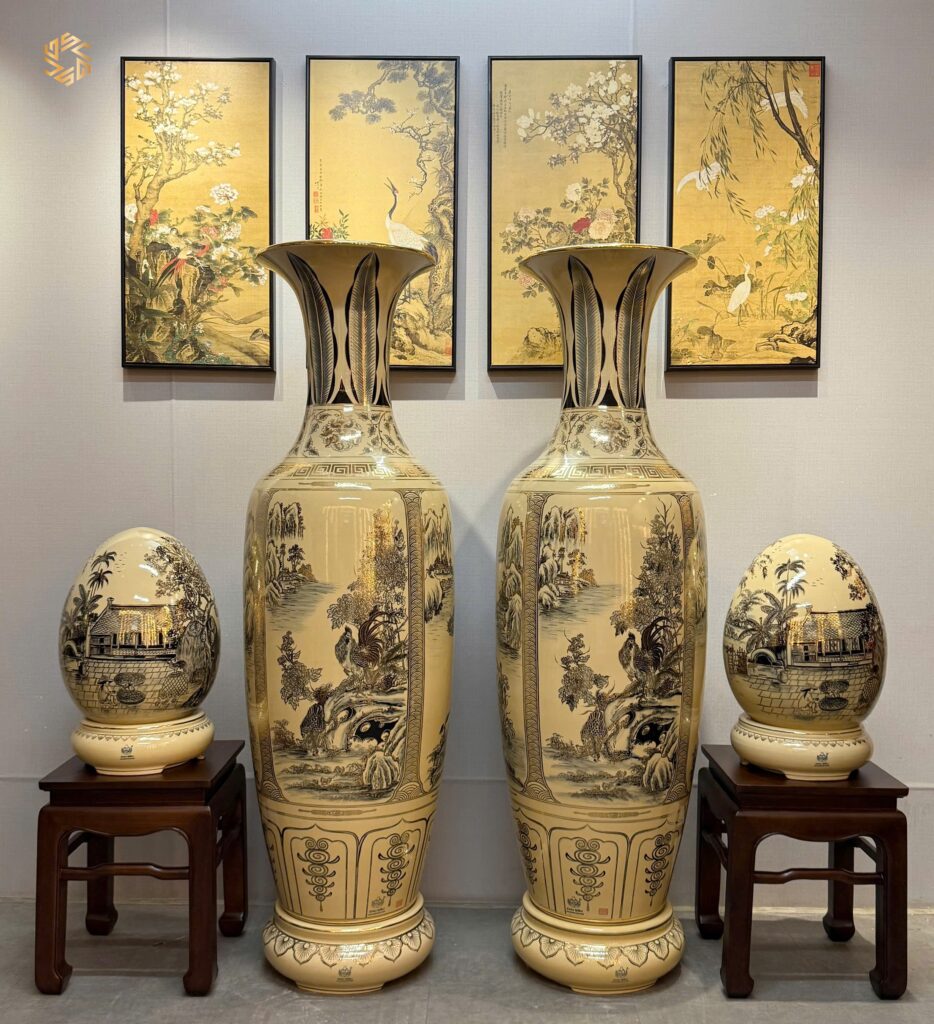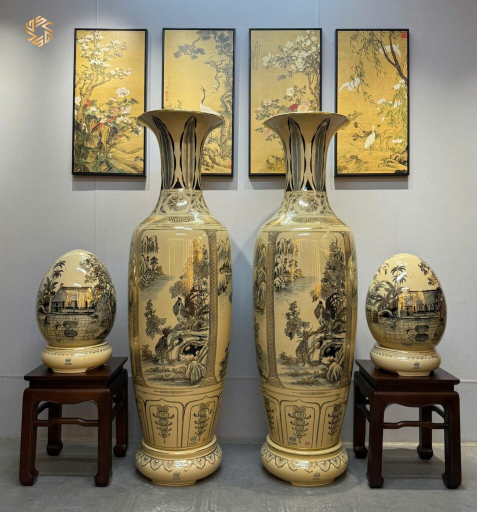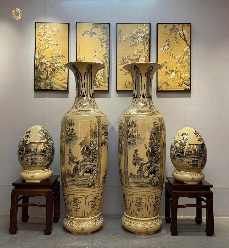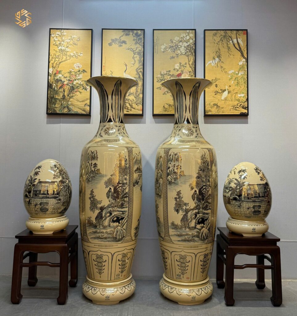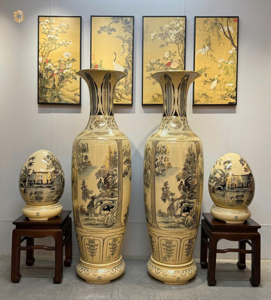 Review Lộc Bình Gốm Chu Đậu Lộc Bình Gốm Chu Đậu 1M55 Sơn Thuỷ Hữu Tình & Trứng Tài Lộc H45 Vẽ Vàng 24K