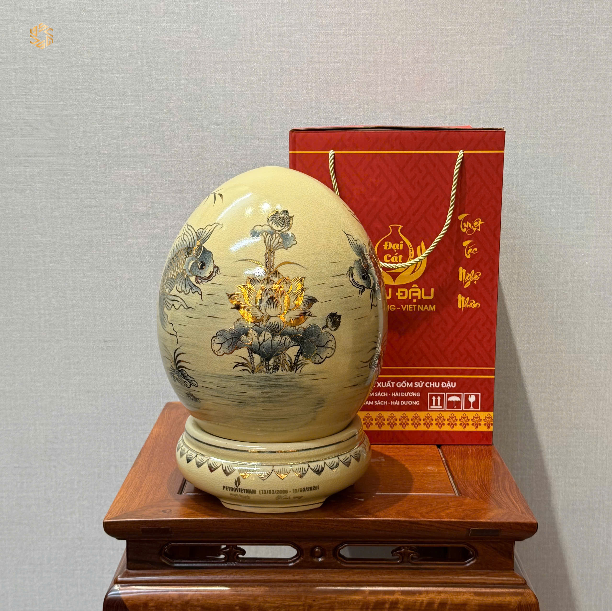 - Trứng Tài Lộc Gốm Chu Đậu thiết kế theo yêu cầu, nâng tầm sự kiện, ý nghĩa Vẽ Vàng 24K từ làng nghề truyền thống Gốm Chu Đậu nổi tiếng của Việt Nam, là món quà tặng vô cùng ý nghĩa phù hợp trong nhiều trường hợp cụ thể như: Biếu Tặng Sếp, Lãnh Đạo, Tân Gia, Tặng Doanh Nghiệp, Hội Nghị…..