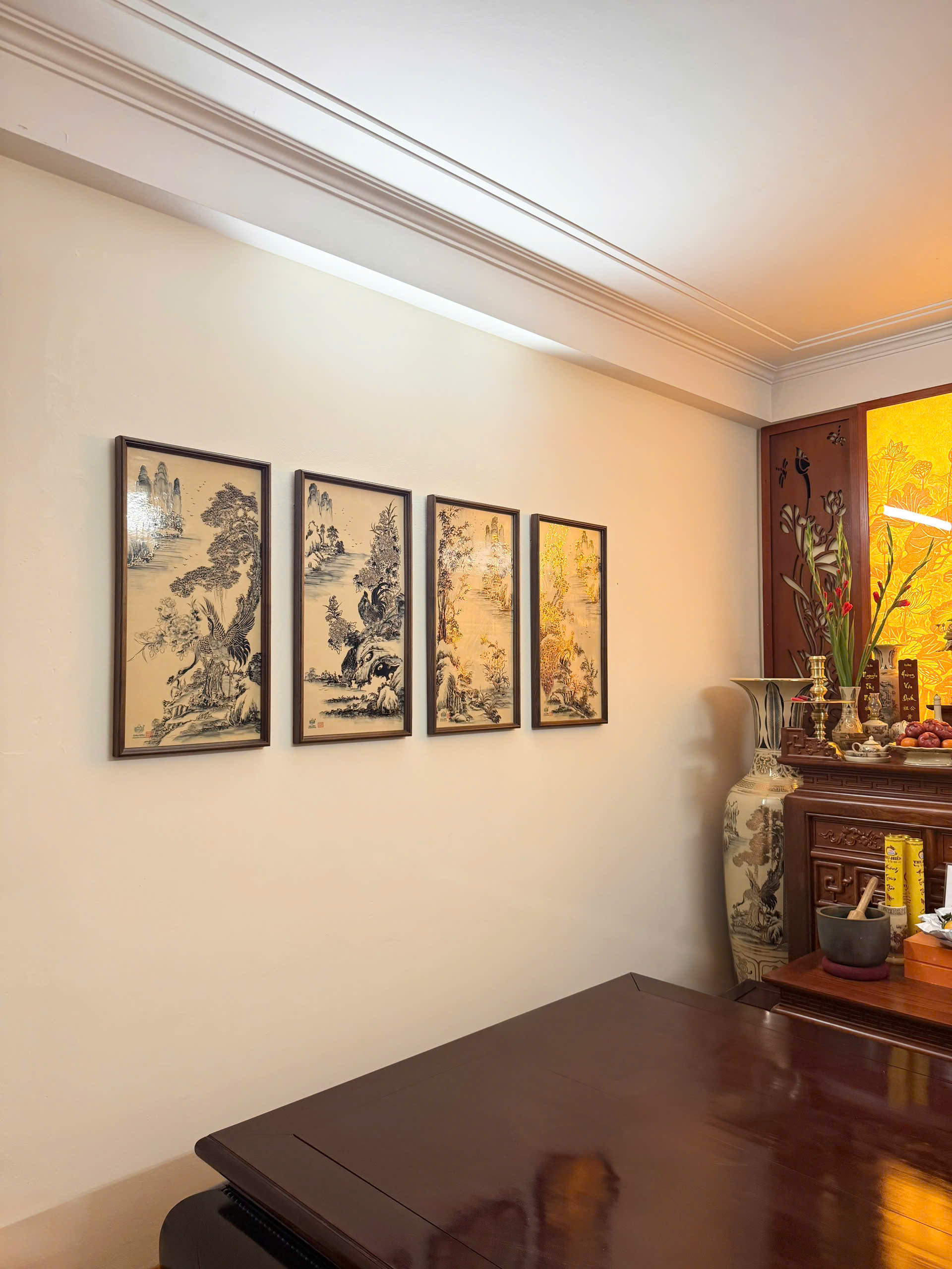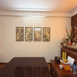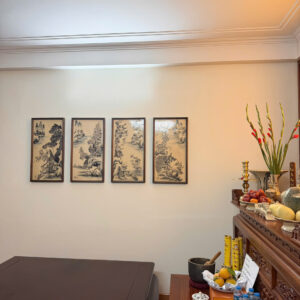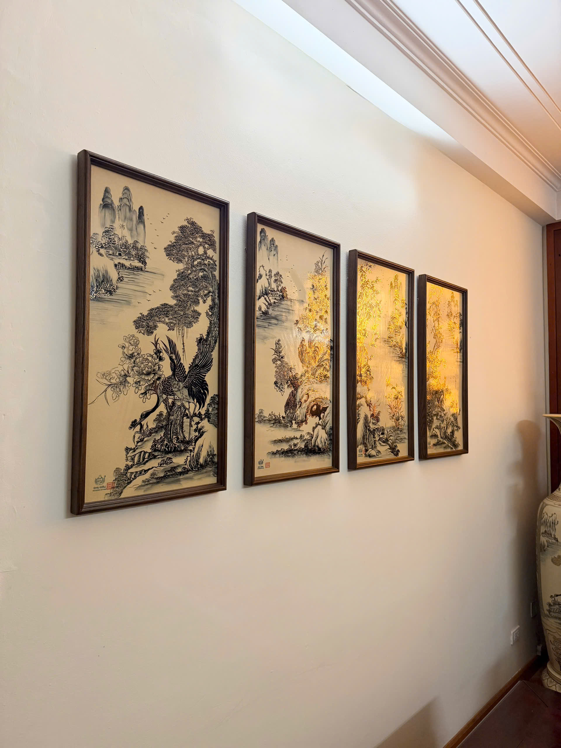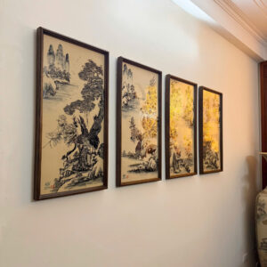- Bộ gồm 4 tranh kích thước : Chiều ngang 43cm, chiều cao tranh 81cm, Độ dày khung tranh là 4cm. Phiên bản vẽ vàng 24k thủ công tinh xảo.